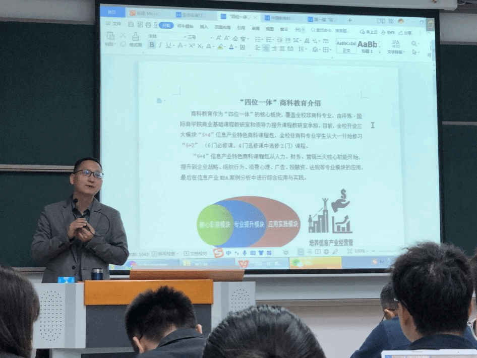 为促进新商科教师学习贯彻落实彭鸿斌董事长讲话精神以及学习新商科教育理念,3月22日19:00,淬炼·国际商学院在智者楼202教室开展了专题学习会。本次会议由范保珠副院长主持,全体教职工参与了学习培训。本次会议主要有四个部分,分别是集团董事长彭鸿斌博士讲话精神学习、新商科教育解读、第一届“闯天涯-新广告人PLUS成长营”介绍以及其他相关工作情况说明。