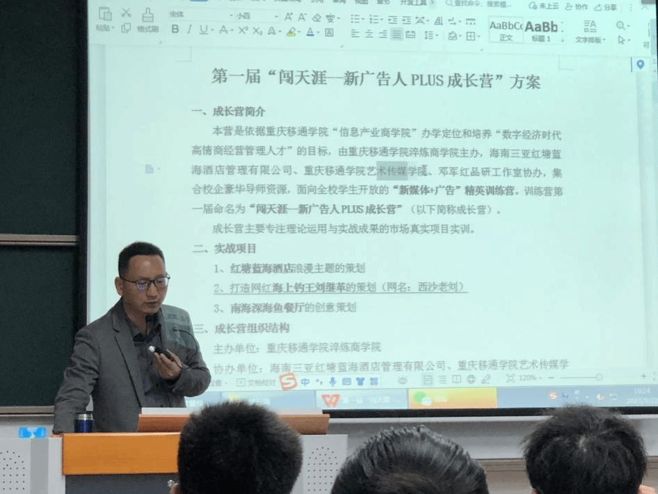 另外,范保珠副院长还简单介绍了第一届“闯天涯-新广告人PLUS成长营”方案。据范院长介绍,该方案专注理论运用与实战成果的市场真实项目实训,将由商学院主办,海南三亚红塘蓝海酒店管理有限公司、重庆移通学院艺术传媒学院、邓军红品研工作室将作为协办。范院长在会上透露该项目会向全校师生开放该成长营,并鼓励老师们及时关注,并鼓励大家携学生共同参加。最后,范保珠副院长就本周期末试卷检查以及其他工作情况进行了点评,他强调,部分期末试卷问题要及时改正,并希望老师们在未来工作中能够更具创新的同时更加细心。