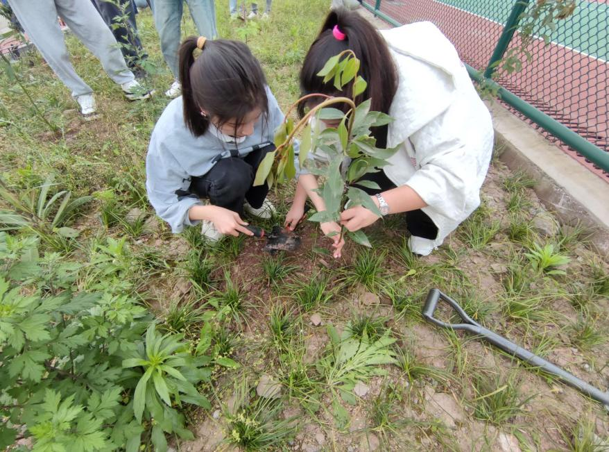 植树现场到处都是忙碌的身影,同学们分工明确,齐心协力,一起挥锹铲土,扶树围土,干劲冲天,每一个步骤都认真对待,用心做好,把一棵棵树苗值入泥土中,整个劳动现场呈现出一片热火朝天的景象。