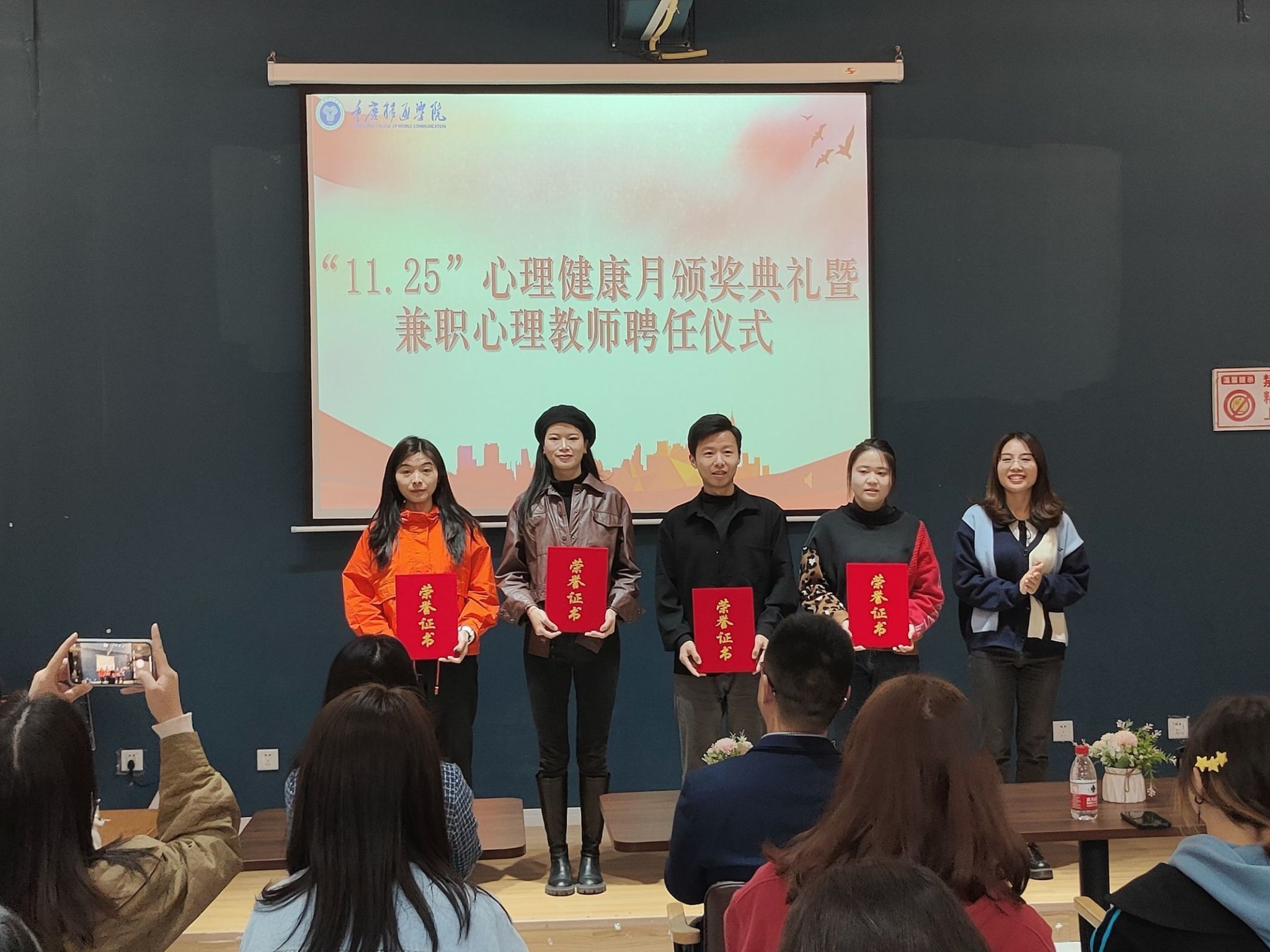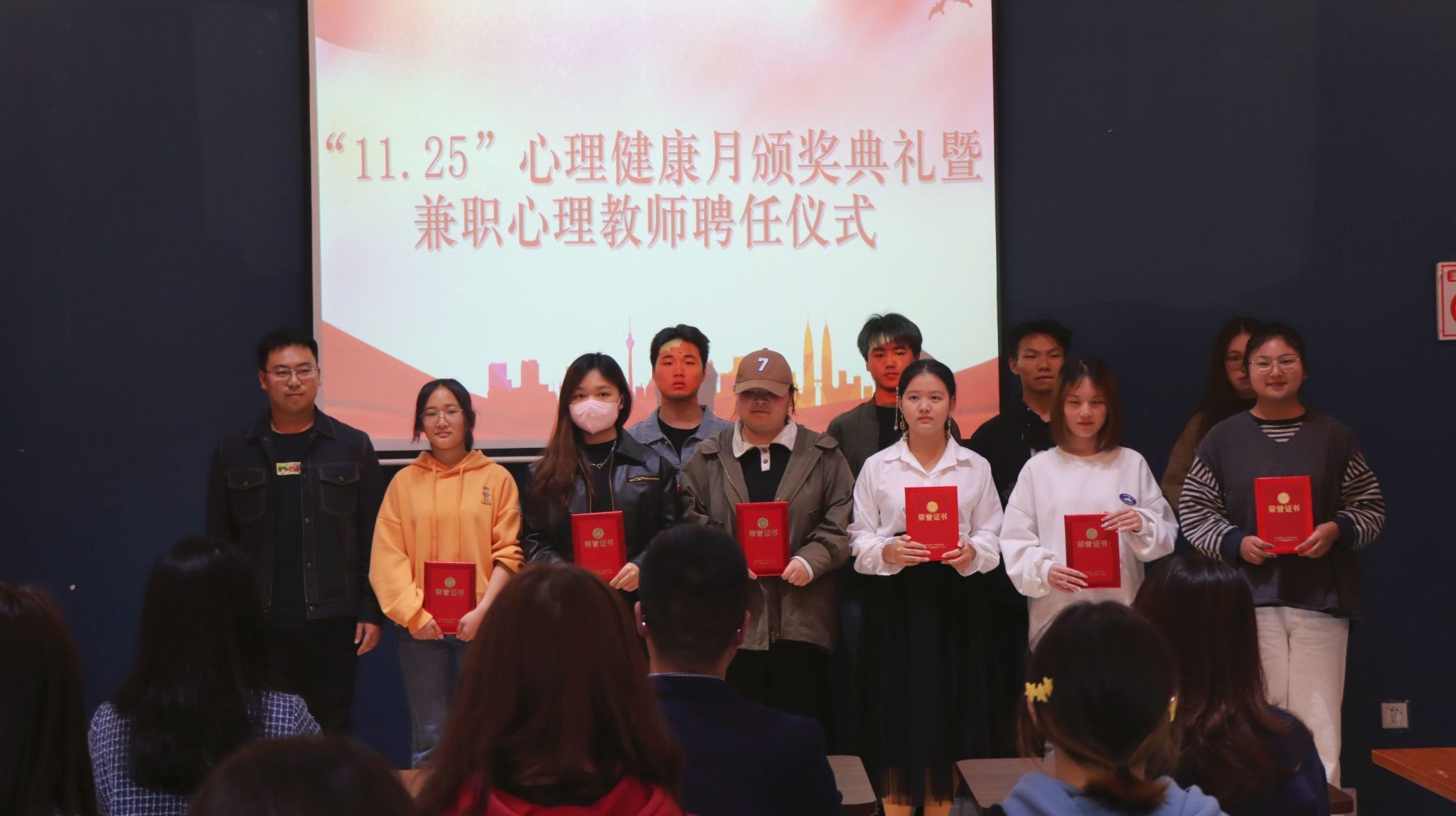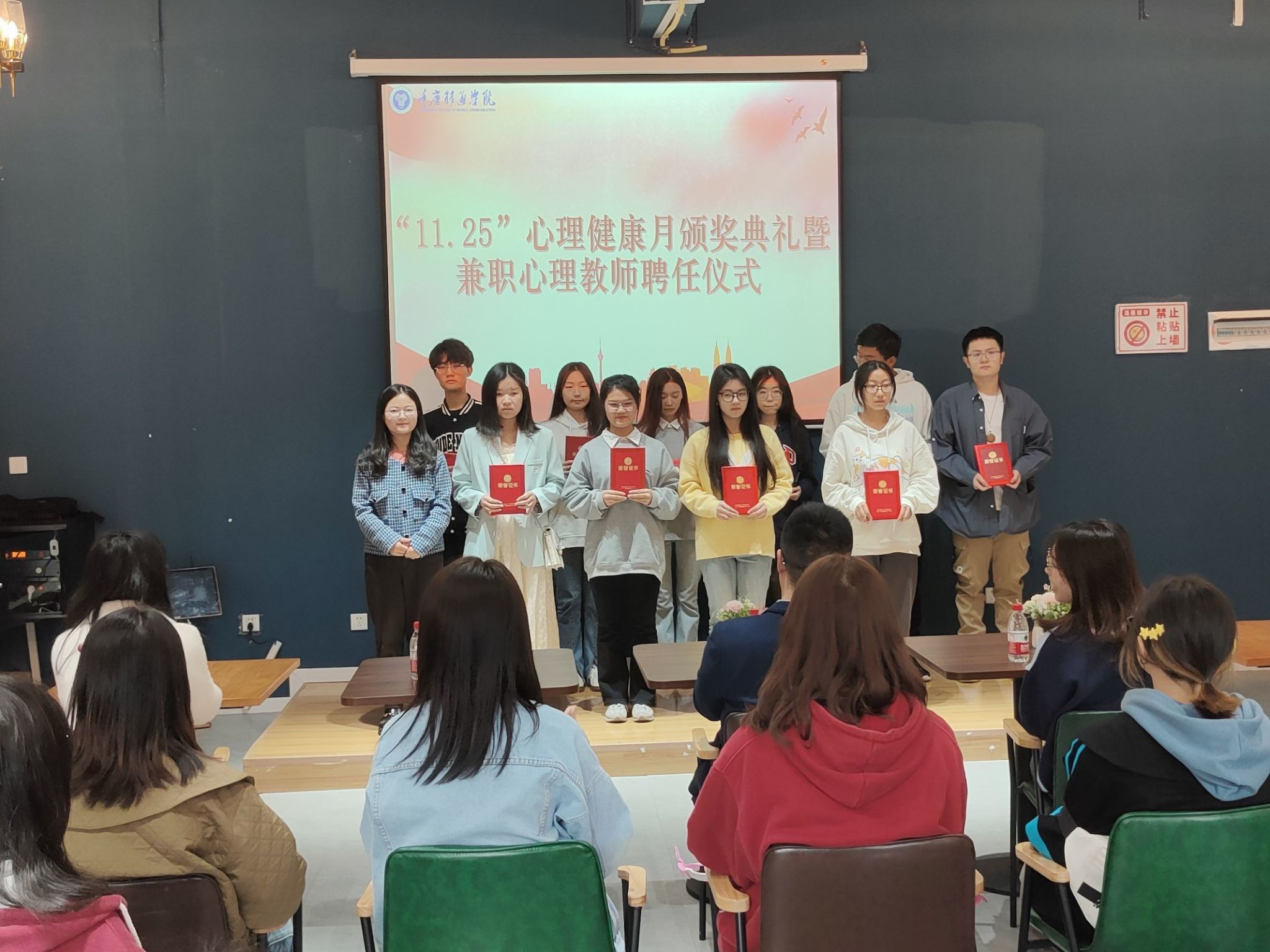 11月为我校心理健康月,“11.25”意在呼吁全体师生“珍惜生命,关爱自己”。我校每年开展心理健康月系列活动,引导师生认识心理健康的重要性,培养健全的人格和良好的心理品质。为总结经验,表彰先进,持续增强心理健康实践活动的吸引力和感染力,同时聘任兼职心理咨询师,加强心理工作队伍建设,3月20日,心理健康中心在綦河书院2号楼东篱·故事茶馆召开“11.25”心理健康月颁奖典礼暨兼职心理咨询师聘任仪式,学生处副处长梁少锋老师、学生科副科长陈永书老师、大数据与计算机科学学院学工办主任阙小梅老师、辅导员谢沅红老师、淬炼·国际商学院辅导员成真老师、学生处专职心理老师张纯霞老师、林红老师,以及各单位获奖的老师和学生代表参与本次活动。