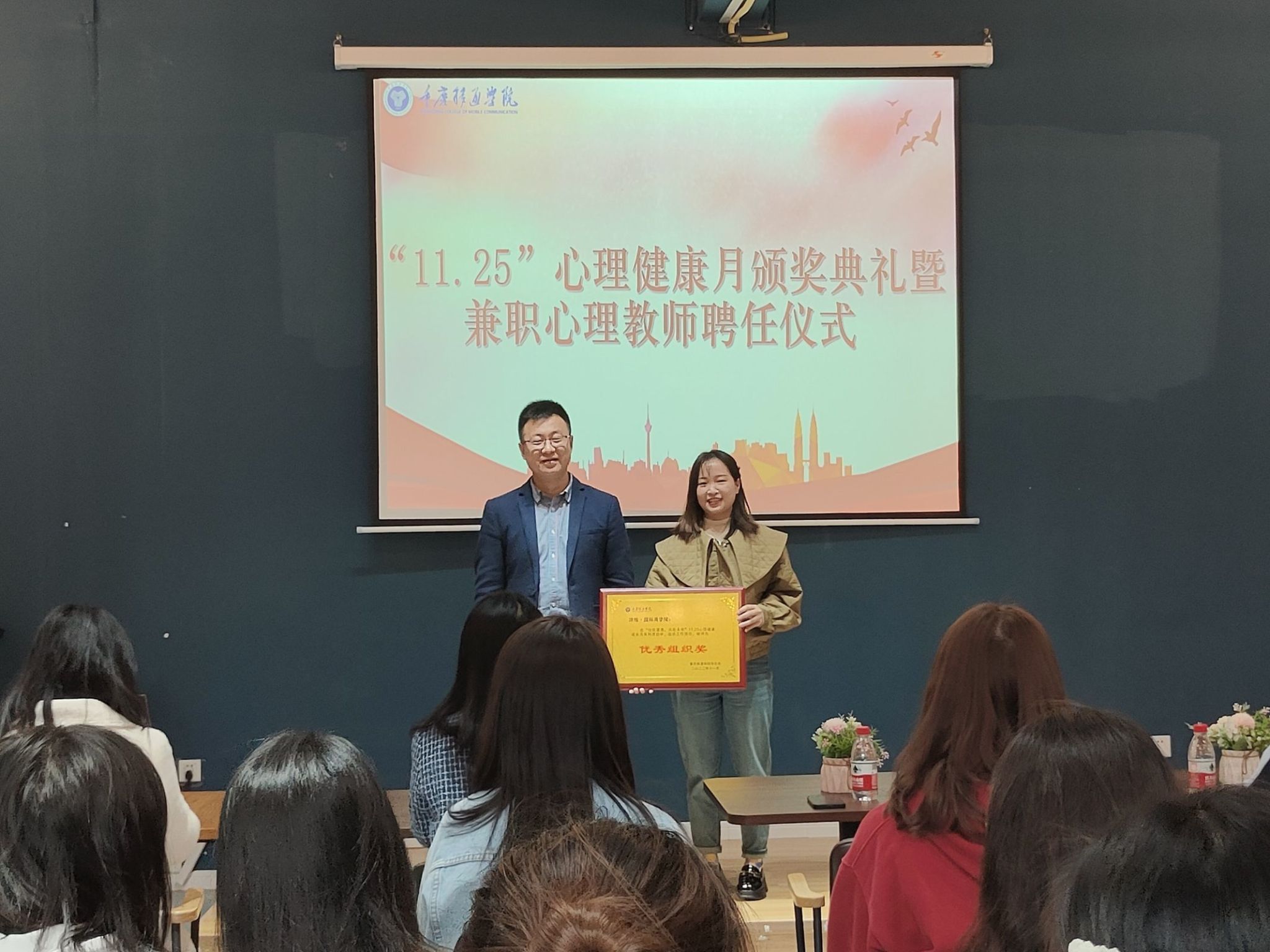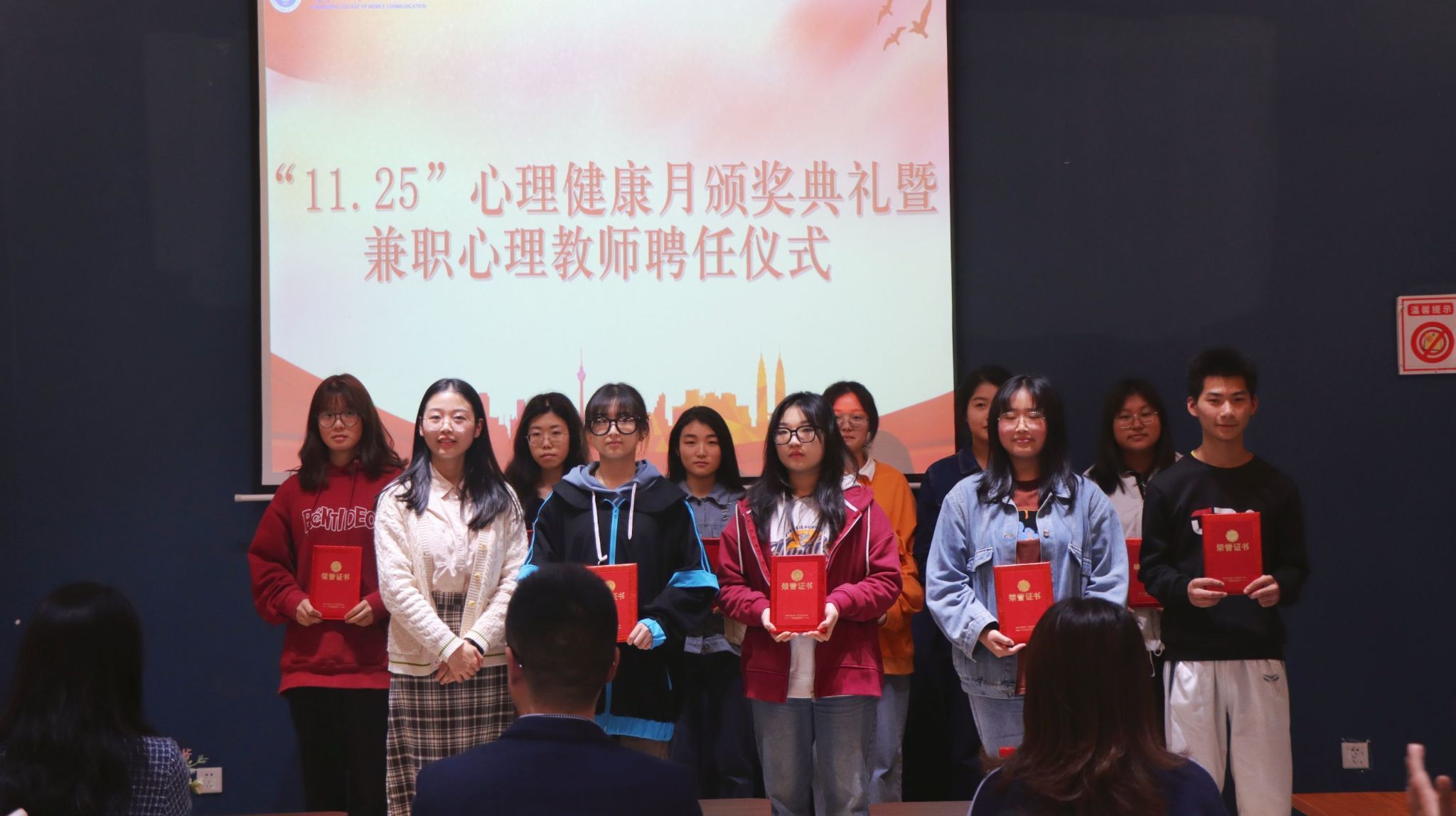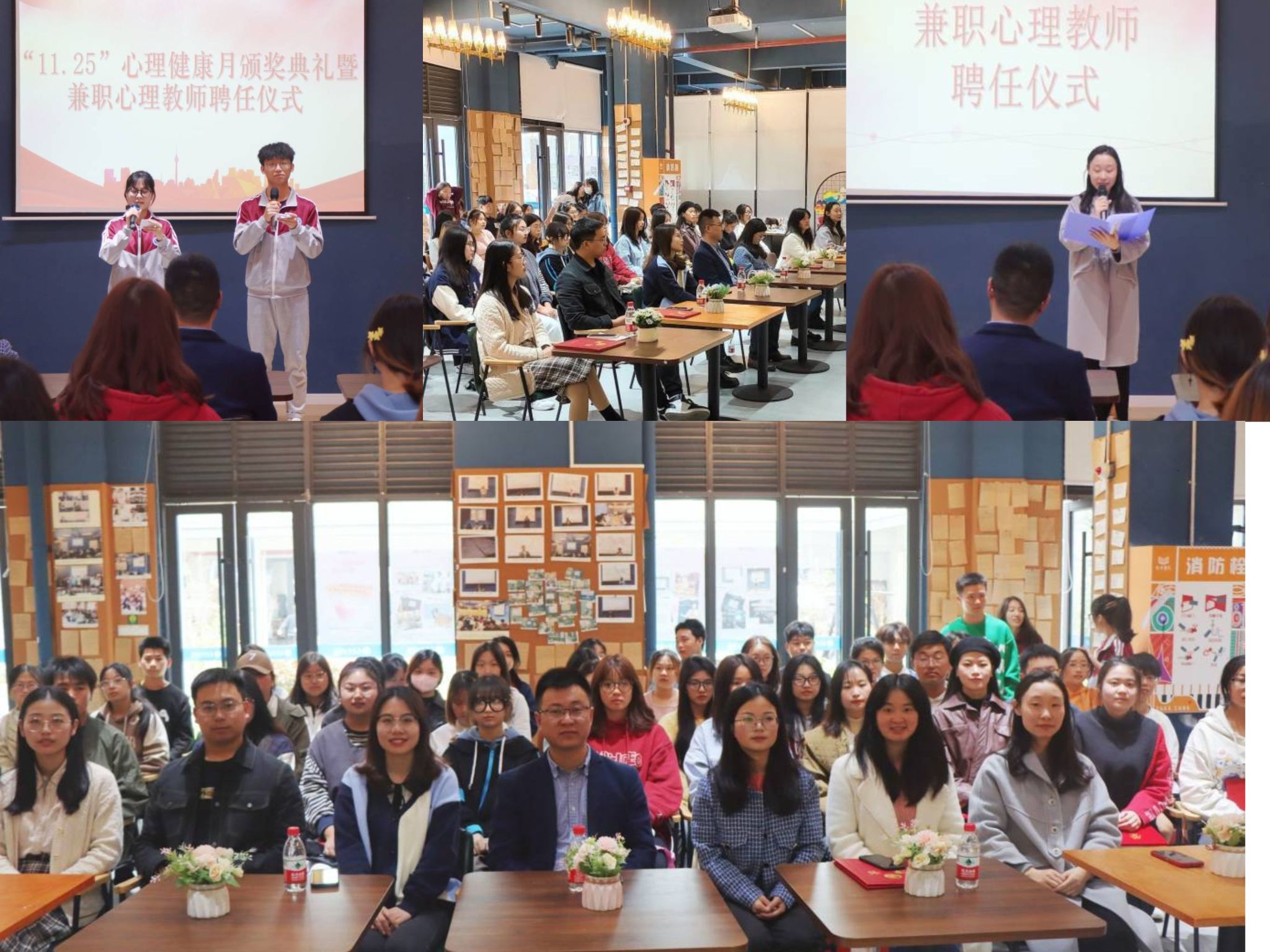 11月为我校心理健康月,“11.25”意在呼吁全体师生“珍惜生命,关爱自己”。我校每年开展心理健康月系列活动,引导师生认识心理健康的重要性,培养健全的人格和良好的心理品质。为总结经验,表彰先进,持续增强心理健康实践活动的吸引力和感染力,同时聘任兼职心理咨询师,加强心理工作队伍建设,3月20日,心理健康中心在綦河书院2号楼东篱·故事茶馆召开“11.25”心理健康月颁奖典礼暨兼职心理咨询师聘任仪式,学生处副处长梁少锋老师、学生科副科长陈永书老师、大数据与计算机科学学院学工办主任阙小梅老师、辅导员谢沅红老师、淬炼·国际商学院辅导员成真老师、学生处专职心理老师张纯霞老师、林红老师,以及各单位获奖的老师和学生代表参与本次活动。