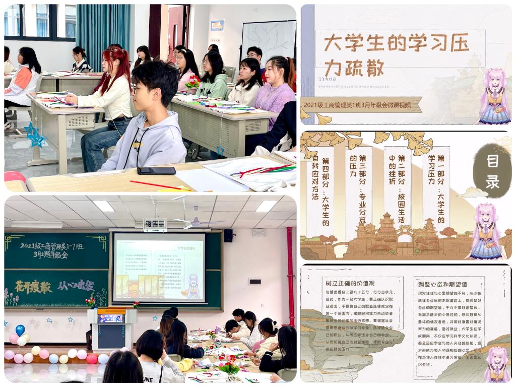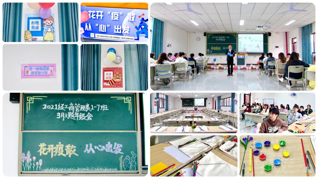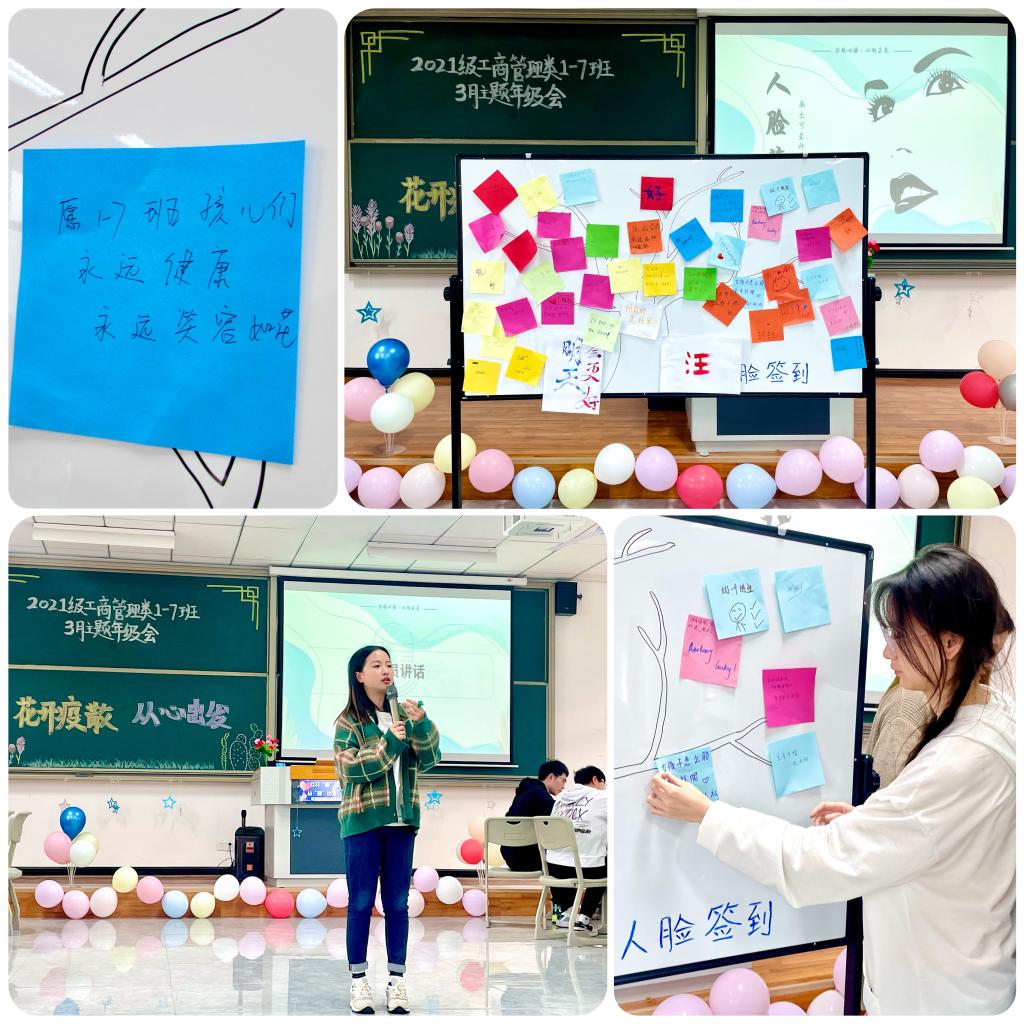 大学生心理健康教育工作是高校“立德树人”中心工作的一个重要内容。在充满希望的2023年,疫情虽已告一段落,但疫情给当代大学生造成的心理焦虑影响仍然存在。另外,随着专业分流、校区更换等问题的影响,同学们的学习压力有所增加。为深化心理健康教育工作,缓解当下同学们存在的心理焦虑、情绪压抑、压力增大等心理问题,2023年3月10日,2021级工商管理类1-7班于勇者楼402教室开展了题为“花开‘疫’散·从‘心’出发”的主题年级会,为同学们带来了一次沉浸式的心理治愈体验。