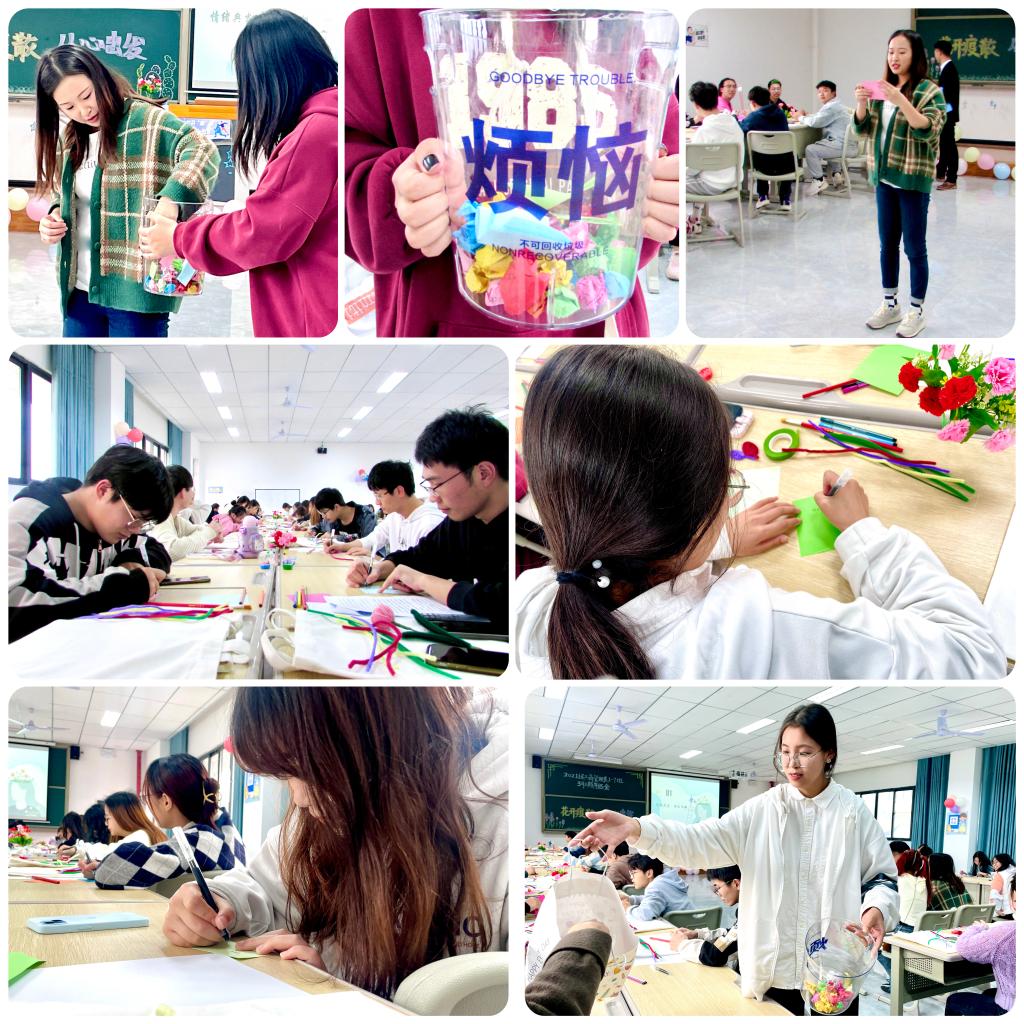 主持人开场提出与日俱增的社会就业压力让大学生的心理压力剧增,据调查研究显示,处于“心理亚健康”状态的大学生不在少数。为了让情绪通过合适的方式宣泄,,大家将烦恼、坏情绪书写于五颜六色的彩纸上,扔进“情绪垃圾桶”,寓意烦恼焦虑统统消散。同时辅导员尹金维老师随机抽取了同学们的烦恼进行了“烦恼回收”,现场进行烦恼疏散排解,针对“学习压力”“失眠焦虑”“专业分流”等共性问题,尹老师都一一给出了贴心的回复和解决建议。在“快乐飞翔”中,大家将自己的快乐记录下来,将它承载在纸飞机上,然后通过放飞纸飞机,让快乐传播,大家踊跃分享着纸飞机上其他同学的快乐,笑作一团,快乐得到了循环。大家的情绪也被调动了起来,逐渐沉浸到了本次活动之中。