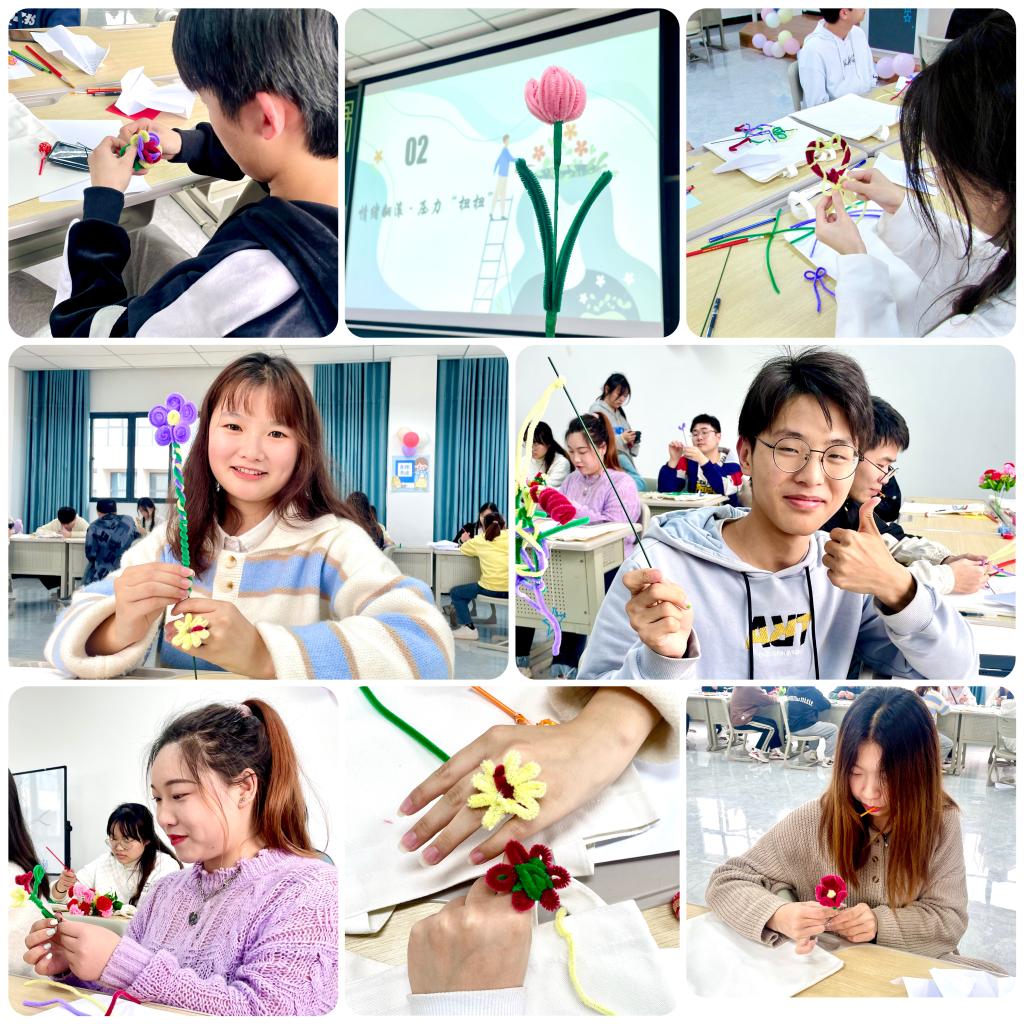 一阵舒缓音乐声里,精心制作的《翻滚吧!情绪君》心理微课视频让大家眼前一亮,二次元的主讲形象让大家倍感亲切。微课视频谈到当下大学生面临的压力和心理健康问题,结合大家的实际情况进行了分析,提出了宝贵的心理压力排解方法。微课结束,活动氛围更显轻松愉快,接下来神奇的扭扭棒成为了大家情绪抒发的重要工具,左扭右扭,一切压力都烟消云散。大家相互分享着,五彩缤纷的扭扭棒在大家的手中化为了形态各异的手工作品——一束花、一根麻花、一个蝴蝶结......