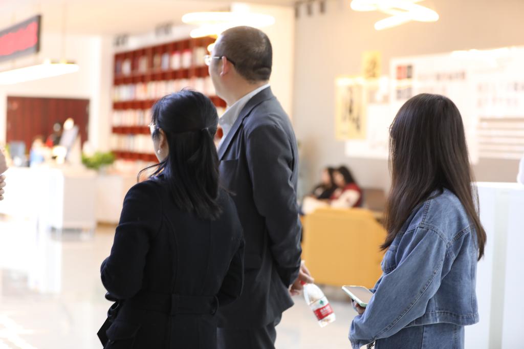 秦馆长引导来宾们参观了图书馆大咖阅读专区,分享了我校开展大咖阅读计划的背景、意义,大咖阅读计划是培养数字经济时代学生商科思维和领导力的有效途径之一。随后来到数字资源专区,给来宾们介绍了馆内电子书借阅机和电子书瀑布流等设备的使用情况。