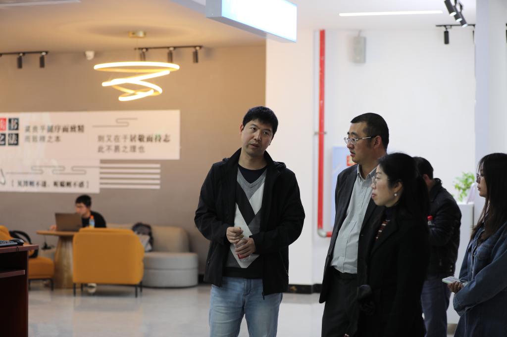 来宾们驻足于图书馆作家领读区,秦馆长为各位来宾详细介绍了作家领读活动、导师悦读分享、新生接待体验和好书荐读等系列我馆长期坚持开展的各项特色阅读推广活动,与各位馆长们交流经验。重庆人文科技学院图书馆杨晓琼馆长对我校开展的作家领读活动进行了高度肯定,通过专业作家领读的方式带领阅读爱好者重读经典既可以用专业的角度重新认识经典,也可以提升同学们的阅读、写作水平。重庆外语外事学院图书馆李玲馆长觉得我校“四位一体双院制”人才培养模式沁润下的学院院长荐书活动非常有意义,有针对性的引导学生进行专业书籍学习;夏建峰副馆长建议两校区图书馆利用地域优势可以多组织读者交流,开展交叉融合的阅读推广活动,促进文理科学生知识丰富。