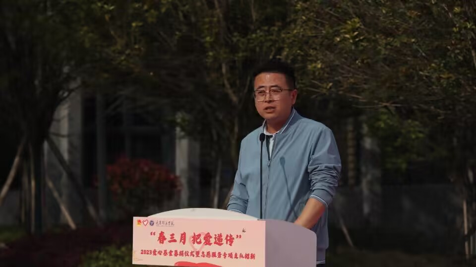 “赠人玫瑰,手留余香”。仪式最后,重庆移通学院綦江校区党委委员、党政综合办公室副主任、工会主席曹瑞峰老师结合自身经历,真挚地表达了对我校移通学子的殷切希望。当下的我们,正逢百年盛世亦是风华正茂,应以实际行动践行志愿服务精神。曹瑞峰老师呼吁志愿者:一是要砥砺初心,做一名爱的创造者,我们应该用真心做心中所想的温度行动,共同让世界变得更加美好;二是淬炼责任担当,做一名爱的实践者,我们应该在实践中不断思考自己的责任与担当,不被困难打倒;三是厚植大爱情怀,做一名爱的传递者,我们应该从每一件小事做起,用大爱胸怀,主动承担社会责任,传递责任与爱,在公益路上越走越远。