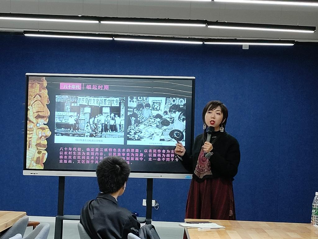 为传承传播传统文化,加强地域合作,提升同学们对地域文化的兴趣与了解,地域文化与城市发展研究院联合綦江美术馆(綦江农民版画院)开设了《黑白木刻》版画兴趣课程。2023年3月15日晚,《黑白木刻》版画兴趣课程在綦河书院1号楼巴渝文化工作室正式开课。本节课由綦江美术馆副馆长黄袁媛授课,黄老师为大家奉献了一场生动而又精彩的视听演讲。