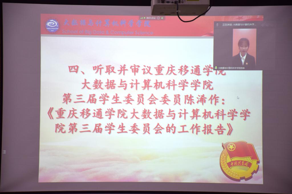 随后,大数据与计算机科学学院第三届学生委员会委员陈浠同学向大会作了题为《永远跟党走·奋进新征程·建功新时代,为建设中国最受尊崇、办学最有特色的一流民办大学贡献青春力量》的工作报告。第三届学生会委员会的工作报告回顾总结了过去一年学生会组织的工作与成绩、问题与不足,强调要继续以习近平新时代中国特色社会主义思想为指导,紧跟时代步伐、创新工作思维,守初心、严作风、办实事,以高度的历史使命感和时代责任感,团结和动员全校同学艰苦奋斗、矢志不渝、创新创造、奋发有为,竭诚服务同学成长成才,在为建设中国最受尊崇、办学最有特色的一流民办大学贡献青春力量。号召各位代表一步一脚印,为重庆移通学院大数据与计算机科学学院学生会迈向一个新的台阶奋勇拼搏,为继续助力推动我院发展贡献青春力量。