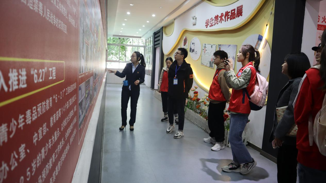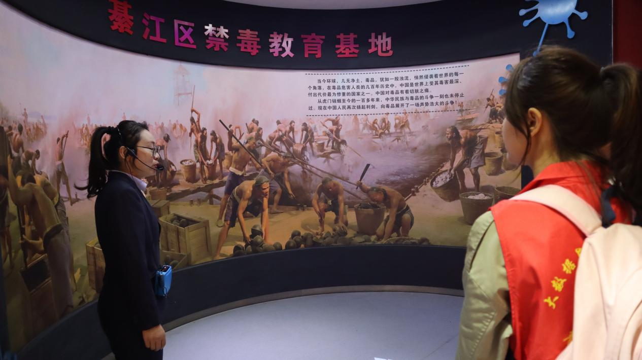 禁毒支队的成员们从学校出发,乘车来到位于綦江区南州中学的区禁毒教育基地,同学们在綦江区禁毒办工作人员的带领下有序进入教育基地。首先,王老师对大家的到来表示欢迎,并邀请大家认真参观,用心感悟国家禁毒决心和禁毒民警的付出,将禁毒相关知识宣传普及给身边更多同学,也希望通过参观后大家能用自己力量帮助禁毒工作,共同建筑起校园拒毒防线。