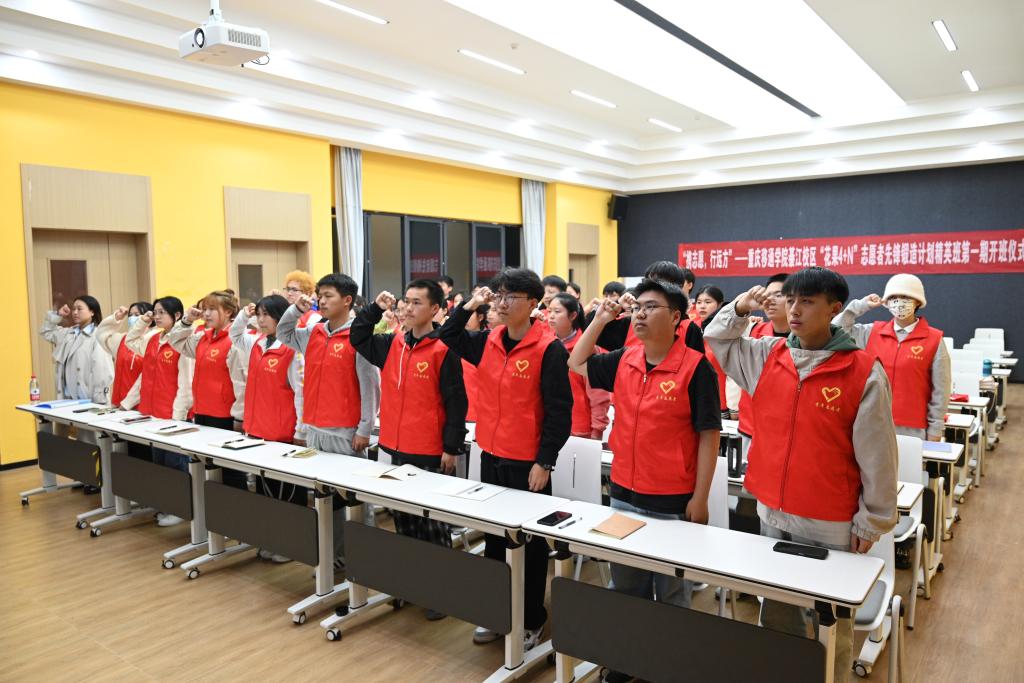 “携志愿,行远方”,这是如此铿锵有力、志者竞远的主题,揭示着我校每一位志愿者、每一位精英班学员满怀斗志,提步向前。在这个时刻,我校綦江校区“花果4+N”志愿者先锋锻造计划精英班第一期全体学员在刘云贺同学的领誓下庄严宣誓,语气慷慨激昂。相信学员们已将这一刻的激情与豪迈铭刻于心,大步向前,在志愿服务这条道路上愈走愈远,终将发挥志愿服务骨干的中坚力量。