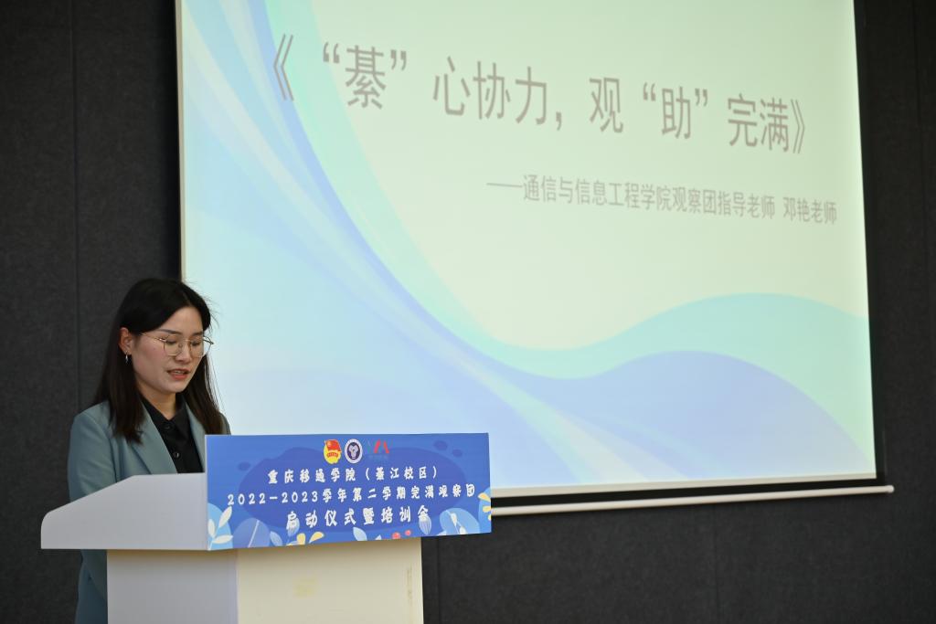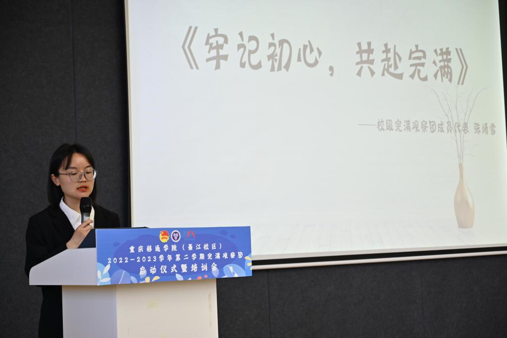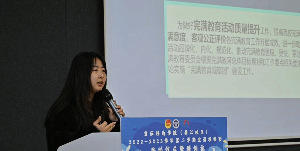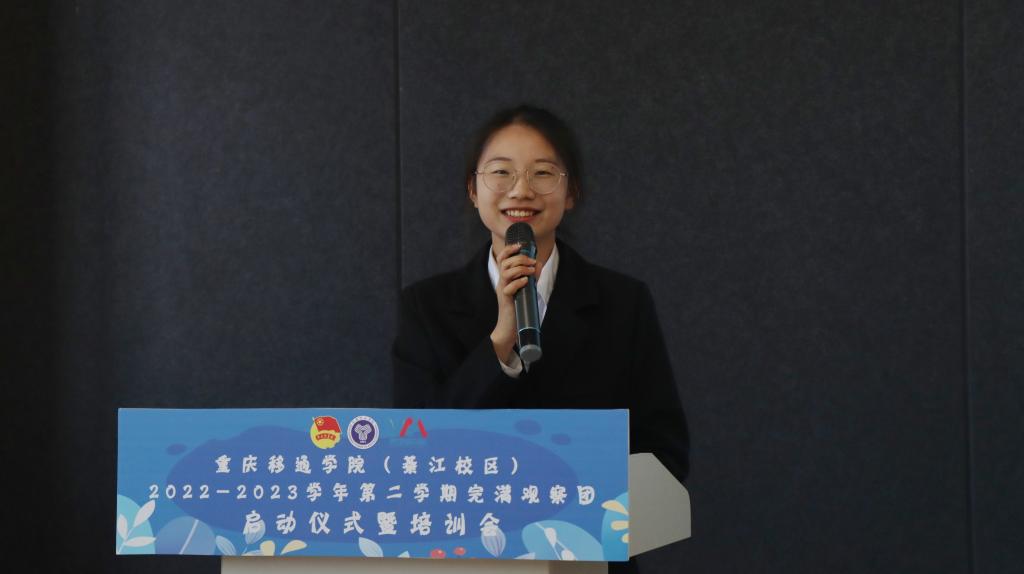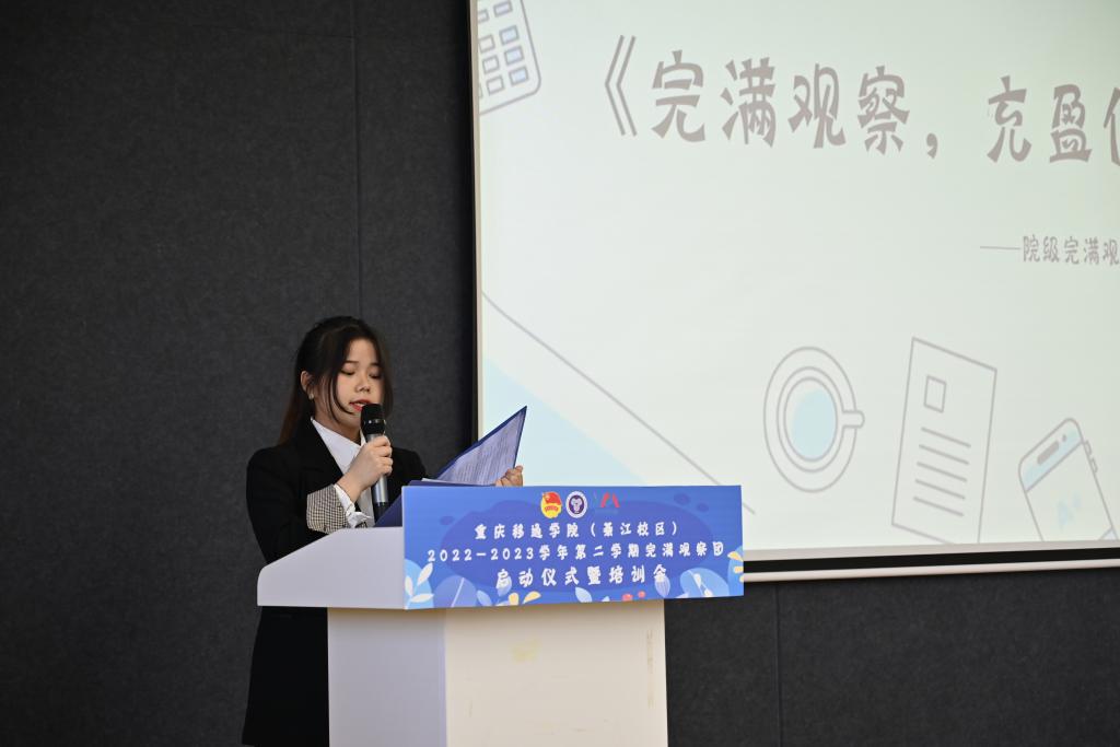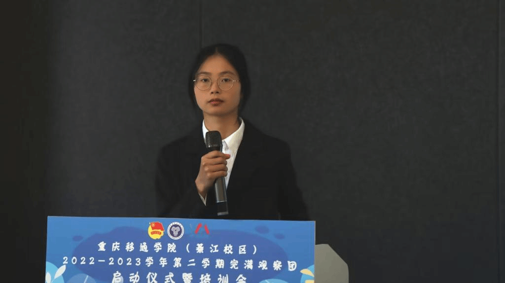 校团委学生干部柯良镱对本学期完满观察团工作进行解读。2022-2023学年第二学期綦江校区完满观察团启动仪式暨培训会正式启动。新学期有新要求、新特色,本学期主要围绕完满教育活动质量提升和观察团工作效率提升为工作重点,加紧落实綦江校区完满观察团队伍建,努力建设成一支勤思考、多技能、重沟通的智囊团。完满观察团是综合性的团队,是推进完满教育活动发展的重要“动力源”;也是能够提升基层活力的重要“发声小喇叭”;更是移通青年动态的“大侦探”。完满观察团更是担负着提升基层活力,助力基层活动更高质发展的重任! 提升基层活力,发挥完满观察团“双面镜”作用,做到“双向反馈”,成为完满教育活动“金牌辅助”,为完满教育活动质量提升闪耀出属于我们的高光时刻!