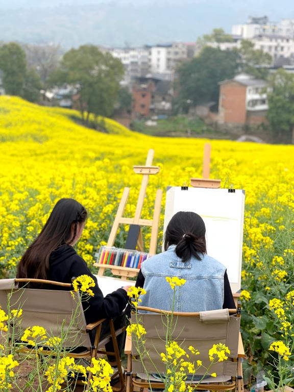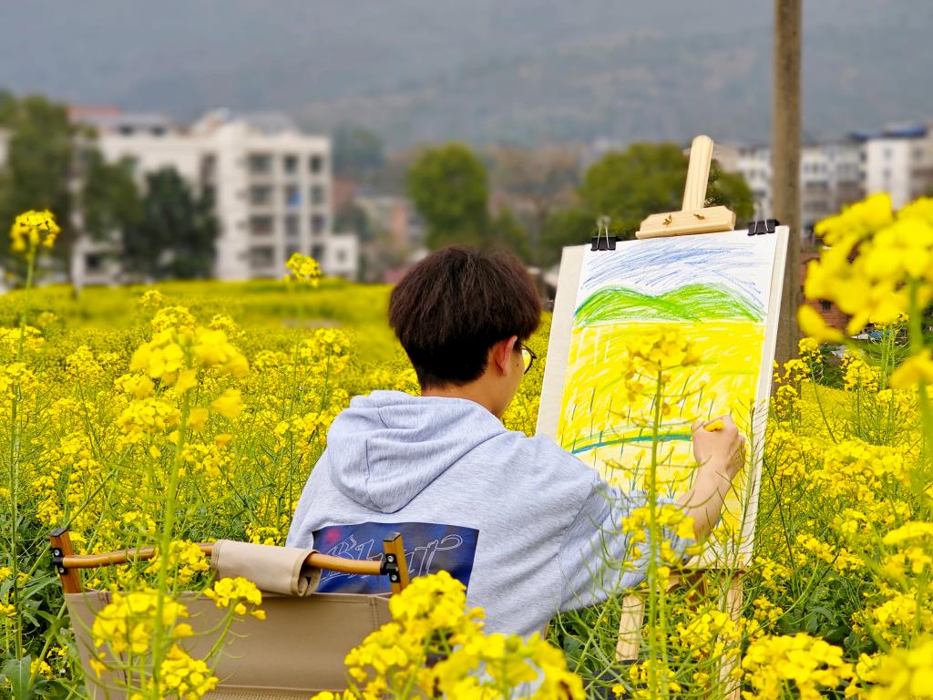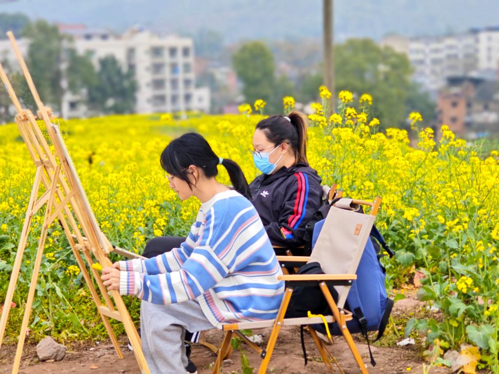 春阳映入花蕊,春风摇动着花枝,莺燕翩然起舞,蜜蜂留连花间,写生的同学们置身于花田中感受春风拂过、花浪翻滚,满山的油菜花随风摇摆,为写生的同学们的画作增添了一丝动态感。他们用手中的画笔,在纸上描绘着这片迷人的油菜花田,晴朗的蓝天与轻舞的花田在他们的画中连成一线,定格着这个生机勃勃的春天。
