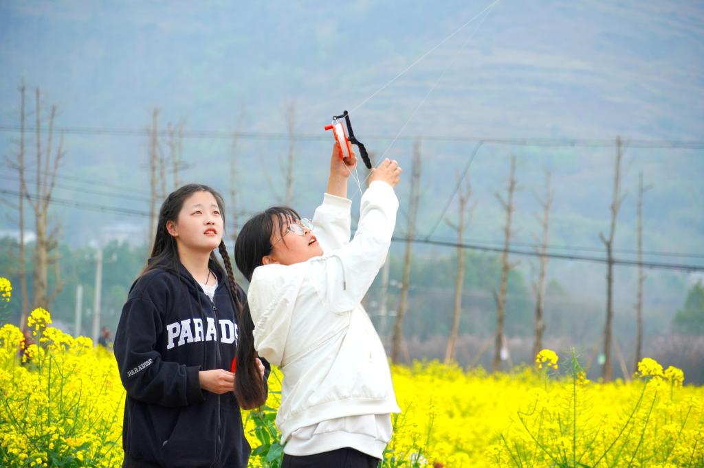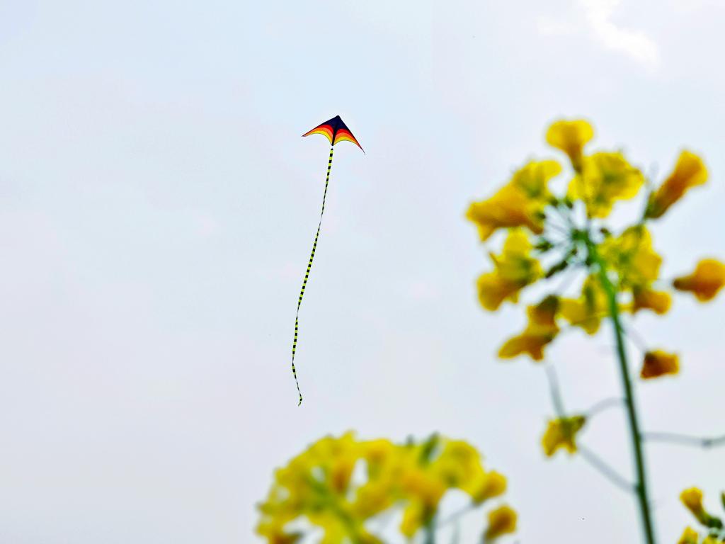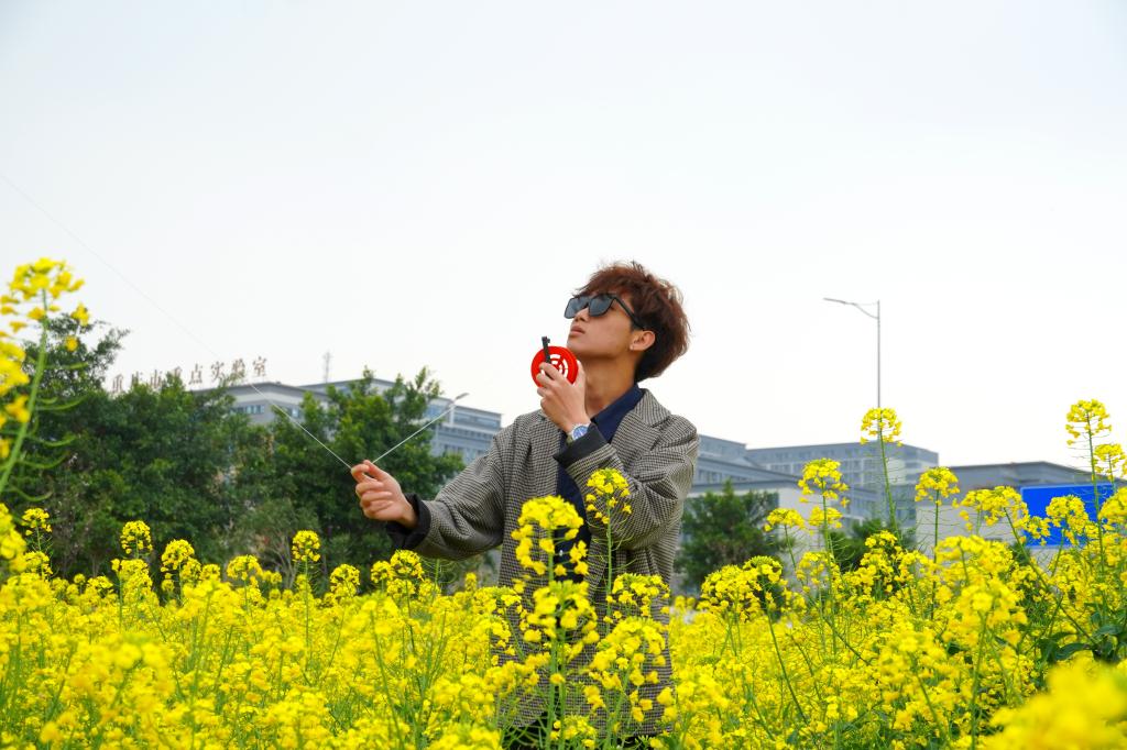 花田另一边,同学们右手举着风筝,左手拽着线,趁着风向有说有笑的奔跑着,他们时而回头看着盘旋打转的风筝,时而停下讨论和想象着放飞后的美景。不过半时,轻盈的风筝终于回到蓝天的怀抱,而同学们手拿着线轴,和周围的朋友一起,盯着它慢慢入神,与花田一起构成了一幅美丽而安静的画卷。