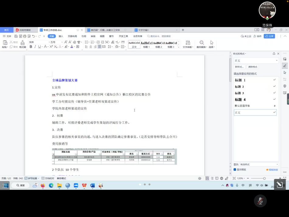 陈小林老师汇报了全球品牌策划大赛和第五届招生广告大赛两部分的工作。她汇报表示上学期筹划了全球品牌策划大赛和第五届招生广告大赛,其中全球品牌策划大赛初赛和复赛已顺利开展,第五届招生广告大赛正和合川校区敲定启动细节。随后陈冰川老师汇报了校企合作专项工作。他表示计划在现有的校企合作单位中筛选出一家进行产教研的深度合作,明确双方的需求后,在专业标准、实操层面、课程体系等方面进行深度融合,以期达到产业需求转化和需求融入教育的最终目的。尹欣老师随后汇报了党建工作。她先后汇报了国际班学生活动组织情况、FOM招新情况、党建活动组织情况等。