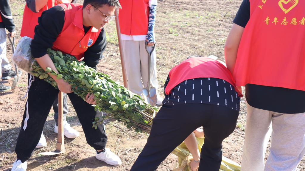 虽然志愿者分散在不同的地方种植,但大家的信念是一样的,心往一处想,劲往一起使。挖坑、种植、培土、育苗、提苗、浇水、施肥……一抔土,一颗苗,一瓢水,一点绿色便从脚下生出,志愿者们分工合作极大地提高了种植的效率,不一会儿脚下本只有杂草的土地便挺起了一棵棵绿色的小身板。