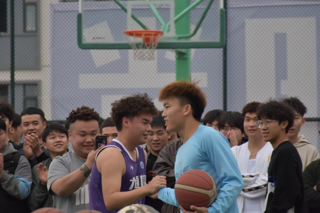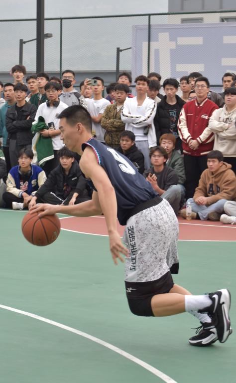 而现场氛围也因为3v3半场接力赛的开始而迎来下一波高潮。DoubleQ球员王圣男、程华山、胡匹夫、李金洋轮流上场守擂,移通学子拾伍队在这场比赛中以11:4的比分率先拿到第一个团队第一,一声声叫好充斥在赛场,我校教职工队的匡鹏、秦晴、胡荣轩老师也不甘示弱,在对方三员大将的强力围追堵截下,以11:7的比分拿下一局,三位授课领域不一样的“扫地僧”向我们展示出什么是真正的深藏不漏,师者风范,他们以活力的姿态引领着移通学子。这场比赛我们看到了移通学子强劲的篮球实力,与“不怕输、不愿输、不服输”、顽强拼搏的运动精神,少男少女们在球场上意气风发,球筐承载了他们的骄傲与美好。