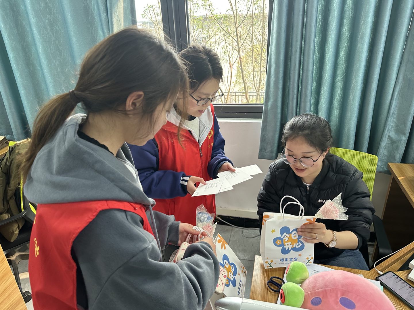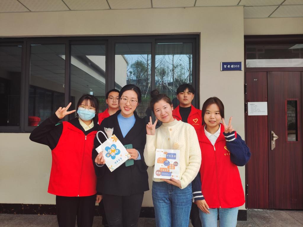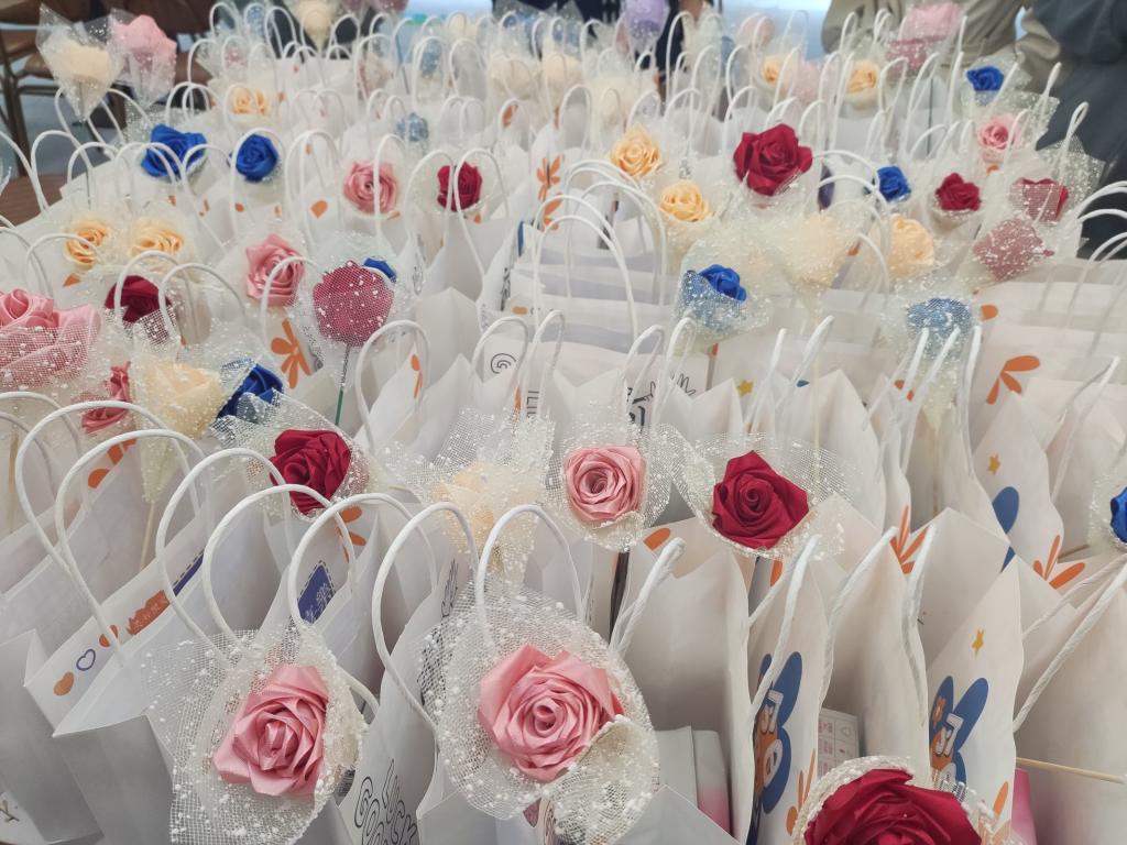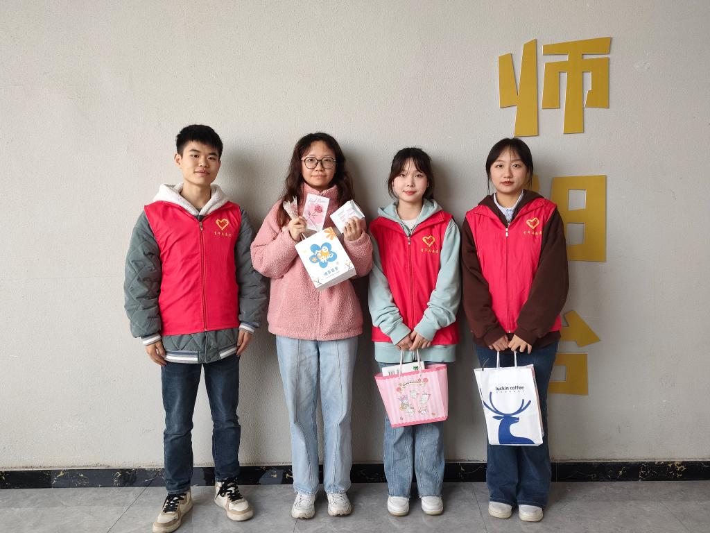 最是人间好颜色,不负春光不负卿,微风和煦,绿柳荡漾,微暖的春风送来真诚的祝福。3月7日下午,“SHE”关爱女性志愿服务专项支队一起为女老师、宿管阿姨们赠送手工玫瑰、祝福卡片和卫生巾。每一朵玫瑰都是支队员齐心合力制作的、每一张卡片都是支队员用心亲手书写的,这不仅仅是代表着对老师们的祝福,也是“SHE”对所有女性的祝福。