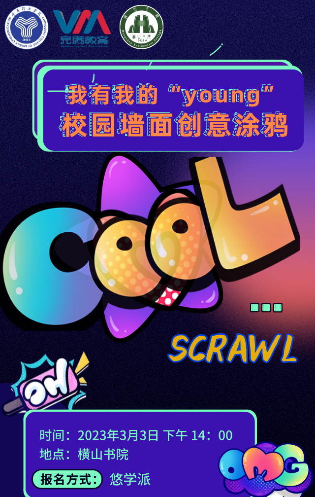 一抹淡彩一笔涂鸦一点颜色,构成一个美丽的世界。横山书院于3月3日在横山书院外围主干道处开展“我有我的young“墙面创意涂鸦活动,通过在墙面涂鸦的方式,让青年人释放天性、自由创作,促进同学与同学之间,老师与同学之间的交流,搭建社区共享与朋辈互助新圈层,培养懂品质、敢突破、有魅力的横山青年,也让移通学子能在那面未知的墙面上留下自己的专属印记。
