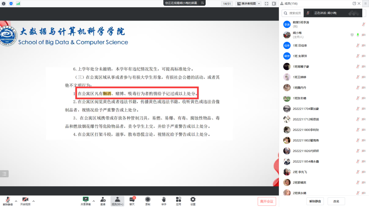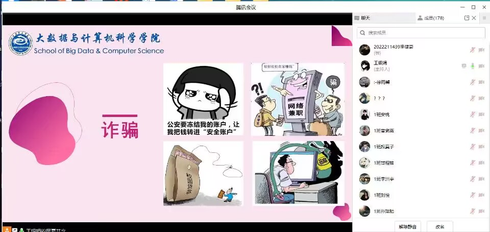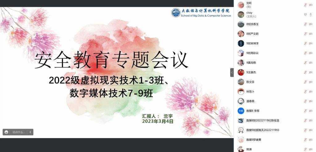 为增强学生的安全意识,引导提高学生自我管理、自我约束、自我服务的能力,保障学生的人身安全,2023年3月3日至4日,大数据与计算机科学学院的辅导员老师们通过线上腾讯会议方式组织并召开了安全教育专题会议,加强学生对自我安全的认知。