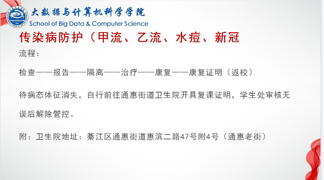预防甲流,众志成城。接下来,辅导员老师们详细地介绍了流感、诺如、水痘等流行性疾病的症状和传播途径,以及流感和普通感冒的不同症状。着重为学生们介绍了流行性感冒、诺如病毒等常见传染病的传播途径和预防方法,切实提高学生对传染病的防范意识。加强自身锻炼,增强免疫力,生活作息要规律,睡眠休息要充足。