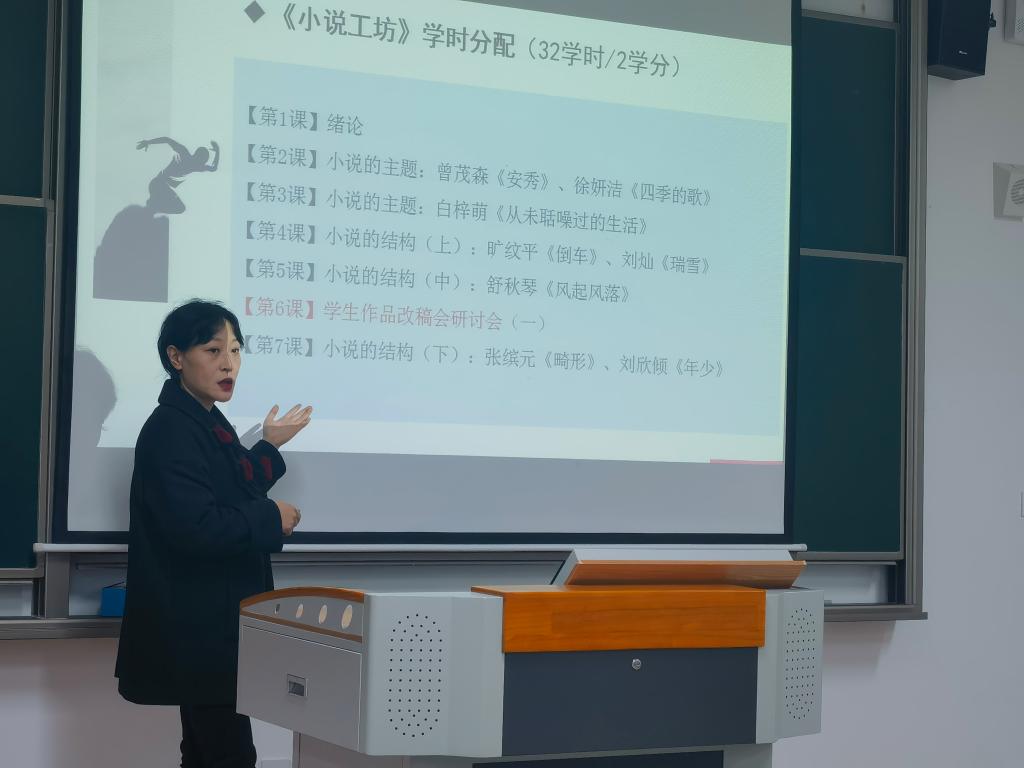 创意写作学院副院长苏瓷瓷老师本学期担任诗歌工坊和小说工坊的导师。《诗歌工坊》课分为七章,三个区块。第一,诗歌理论和诗歌史:如《传统诗歌与现代诗的区别》《海子与荷尔德林诗歌比较》《世界现代诗登场》《中国现代诗时间》等,以老师讲授,组织学生讨论的方式进行;第二,写作进行时:如《我偏爱写诗的荒谬》《观察黑鸟的N种方式》《自1979年3月》等,以辛波斯卡、华莱士·史蒂文斯、特朗斯特罗姆、翟永明、北岛等诗人的经典诗作为模仿对象,进行同主题写作;第三,学生原创诗歌研讨:一学期三次,以老师组织学生互评诗作的方式进行。授课方式集合了写作与研讨、讲授与辩论、阅读与分析,以期提高学生的创作、思维、表达和鉴赏能力。