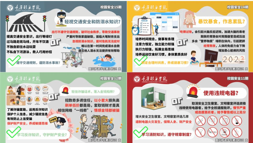 作为新冠病毒感染调整为“乙类乙管”后的首个开学季,为确保全员学生均符合健康入学条件,学校前置学生安全返校工作,部署开展返校前健康监测,确保健康开学、安全开学。宿舍区域提前恢复工作状态,建立健康驿站,配齐人员物资,宿舍值班员提前返工完成楼栋巡查,排查安全隐患整改。校内各处投放各类宣传教育海报,寝室大厅循环播放安全教育视频,营造“时时在提醒,处处讲安全”的校园氛围。各学院通过年级会、班会开展主题教育,学校职能部门、学院辅导员、宿舍值班员、安全巡查员深入学生寝室走访慰问,送上新春祝福,排查大功率电器使用、危险物品存放、寝室酗酒等问题,消除可能存在的安全隐患,提醒同学们注意防火、防盗、防网络诈骗等,提高同学们的安全意识,提升防骗识骗能力。