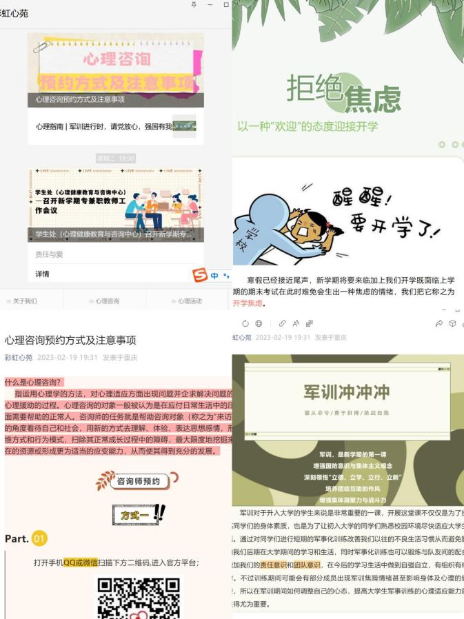 开学预备周,心理健康中心积极推进学生返校后心理评估工作,重点关注危机等级较高的学生,通过面对面的心理咨询,深度访谈了解具体情况,帮助学生进一步调节不良情绪。发布心理推文、视频大力普及心理健康教育知识,讲解开学后积极调试心态、舒缓考试压力的方法、分析军训过程中可能存在的情绪困扰,夯实学生应对心理问题的能力与本领。学院辅导员通过1对1谈心谈话,持续跟进重点学生关注,与学生加强情感联结,帮助学生打开心扉,掌握学生思想动态。完善优化心理健康教育“学校-心理中心-学院-班级”工作网格,开展心理委员负责人的选拔,以朋辈力量拉近学生之间的距离,以精准、高效的方式找到学生心理工作的切入口,有效提升心理育人水平。