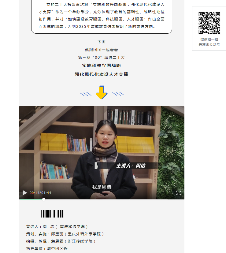 志愿者们回到家乡,带着对青春的志愿,带着对服务人民的信念,50余名同学分别在重庆市綦江区人民政府、共青团渝中区委,以及山西介休市人民检察院、河南兰考县桐乡街道办事处等党政企事业单位、社会机构组织中参与工作。2021级数据科学与大数据技术贾轩同学来到家乡街道参加服务,在平定共青团官微上分享了“返家乡”心得,2022级数字媒体技术周洁同学担任渝中区“00”后讲党的二十大宣讲员,在“渝中青年”官微上展现风采……志愿者们通过开展政务、企业、公益、社区、文化、乡村振兴、网络“云实践”等志愿服务,实打实地让自己进一步了解国情、感知社会、热爱家乡、服务群众志愿梦想。