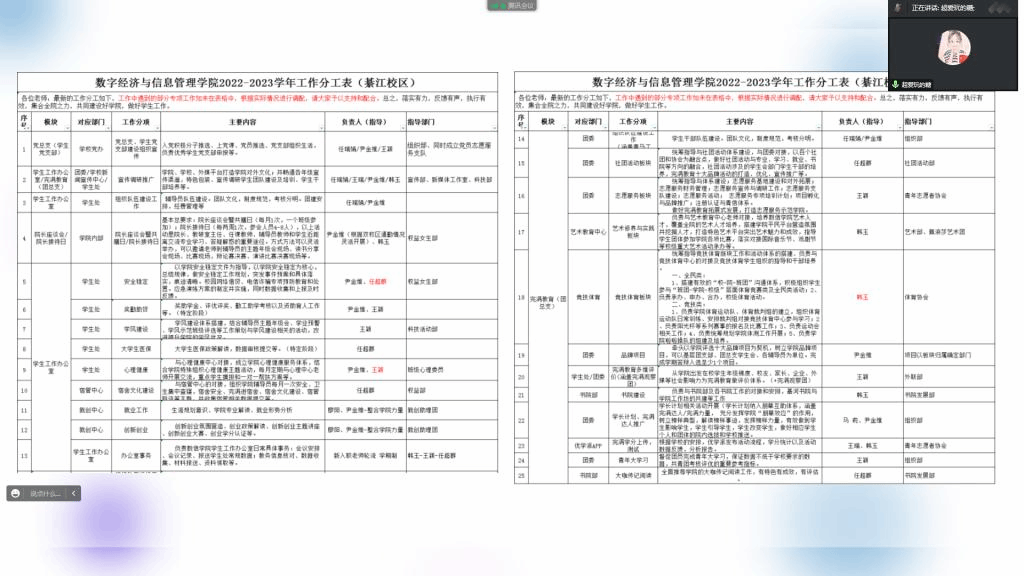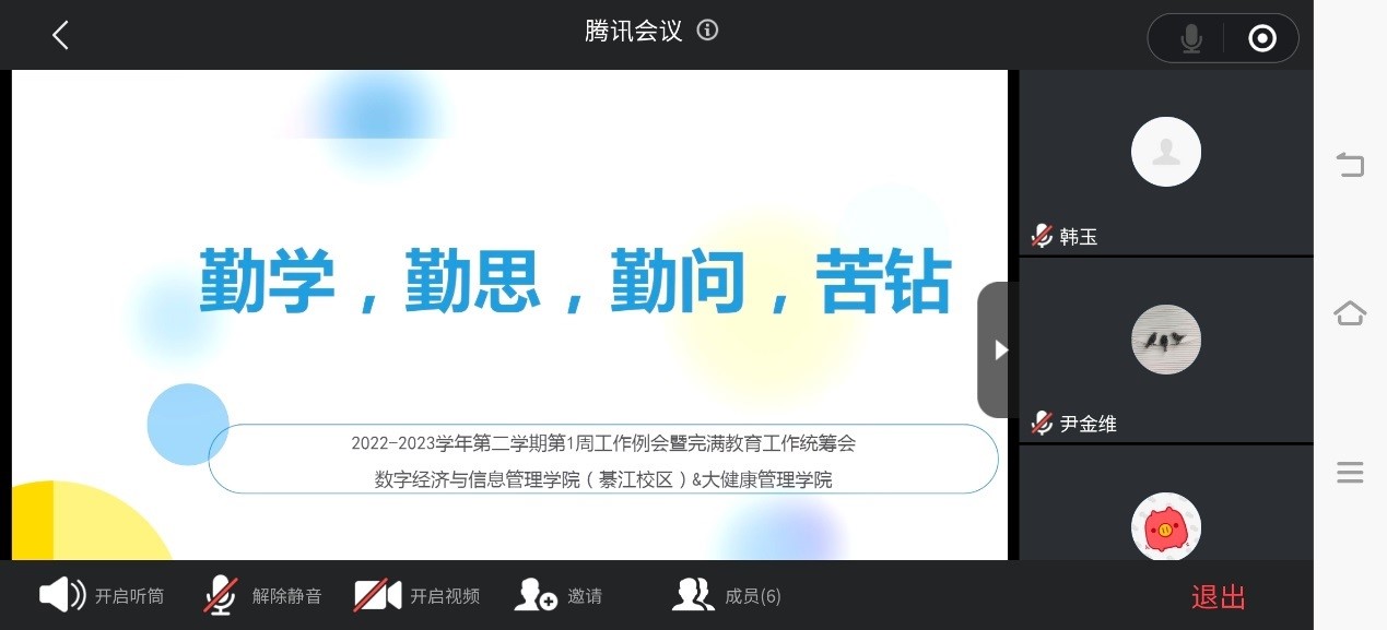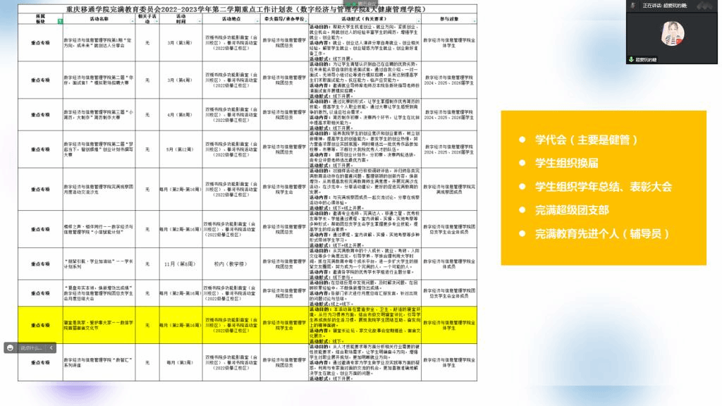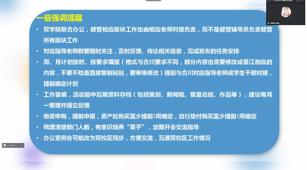 2023年2月23日16时,重庆移通学院数字经济与信息管理学院(綦江校区)&大健康管理学院2022-2023学年第二学期第1周工作例会暨完满教育工作统筹会在云端召开,学工副院长任瑞娟和两院全体辅导员参加会议,会议由学工办主任尹金维主持。