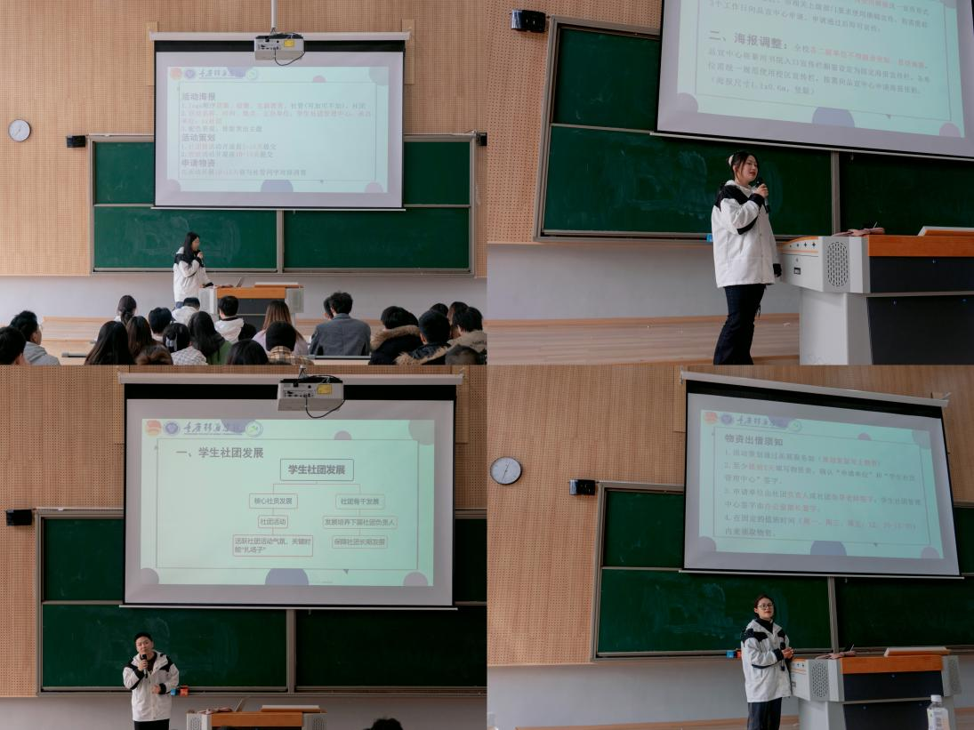 会议伊始,学生社团管理中心拓展服务部干部段宇璐先对本学期重点活动工作进行简要阐述。新的学期亦是新的开始,社团活动也不断多元化延伸,不仅有日常活动的开展,还有独具社团风采的特色活动为社团发展做加持。多元社团活动的呈现,离不开社团活动开展的流程。会议上学生社团管理中心下设的四个部门为45个社团的负责人再次强调并解读具体对接工作以及相关工作的运行流程,进一步明确了活动申办流程的注意事项、宣传材料的利用、物资及奖状申请流程等社团活动工作详情,为本学年学生社团工作的开展奠定的良好的基础。相信社团在社管四个部门的服务与管理下,社团活动的开展会运筹帷幄之中,决胜千里之外。