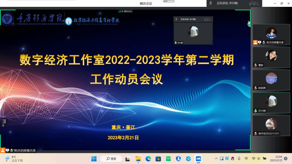“二月二,龙抬头,风调雨顺好年头”,在2023年2月21日,数字经济工作室开展了2022-2023学年第二学期工作动员会议,会议由数字经济工作室指导老师乔兴刚主持,数字经济与信息管理学院数字经济教研室主任陈明燕老师、工作室主干成员欧杨、曹新、单芹芸参与。正如“二月二龙抬头”寄托了人们对未来的美好期望,本次会议明晰了数字经济工作室的发展方向以及本学期任务重点。