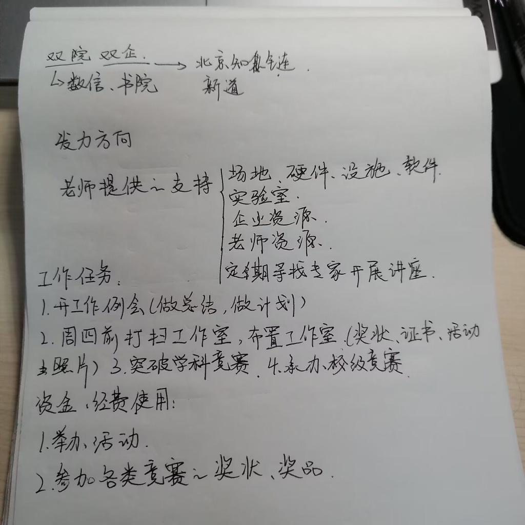 在会议中,工作室指导老师乔兴刚介绍了工作室基于双院双企设立的背景,并给工作室的主干成员介绍了工作室成立的初衷。乔老师指明接下来的工作任务是将数字经济工作室逐步完善起来,并在学科竞赛和书院活动中发挥积极作用,使它成为工作室成员学习和进步的地方。同时乔老师提出要制定数字经济工作室相关的规章制度,制定阶段计划,定期开工作例会进行总结,使工作室能稳步发展。数字经济教研室主任陈明燕老师详细介绍了学校关于学科竞赛的管理办法,以及ABC各级学科竞赛名单,要求工作室的几位骨干成员为工作室之后参加学科竞赛做好准备。在工作室的发展上,学院老师会提供硬件和软件支持,如实验室场地、企业资源、教师资源和专家讲座等。两位老师都提出了对工作室的期望,希望工作室能够成长为能举办活动和各类竞赛的成熟工作室。