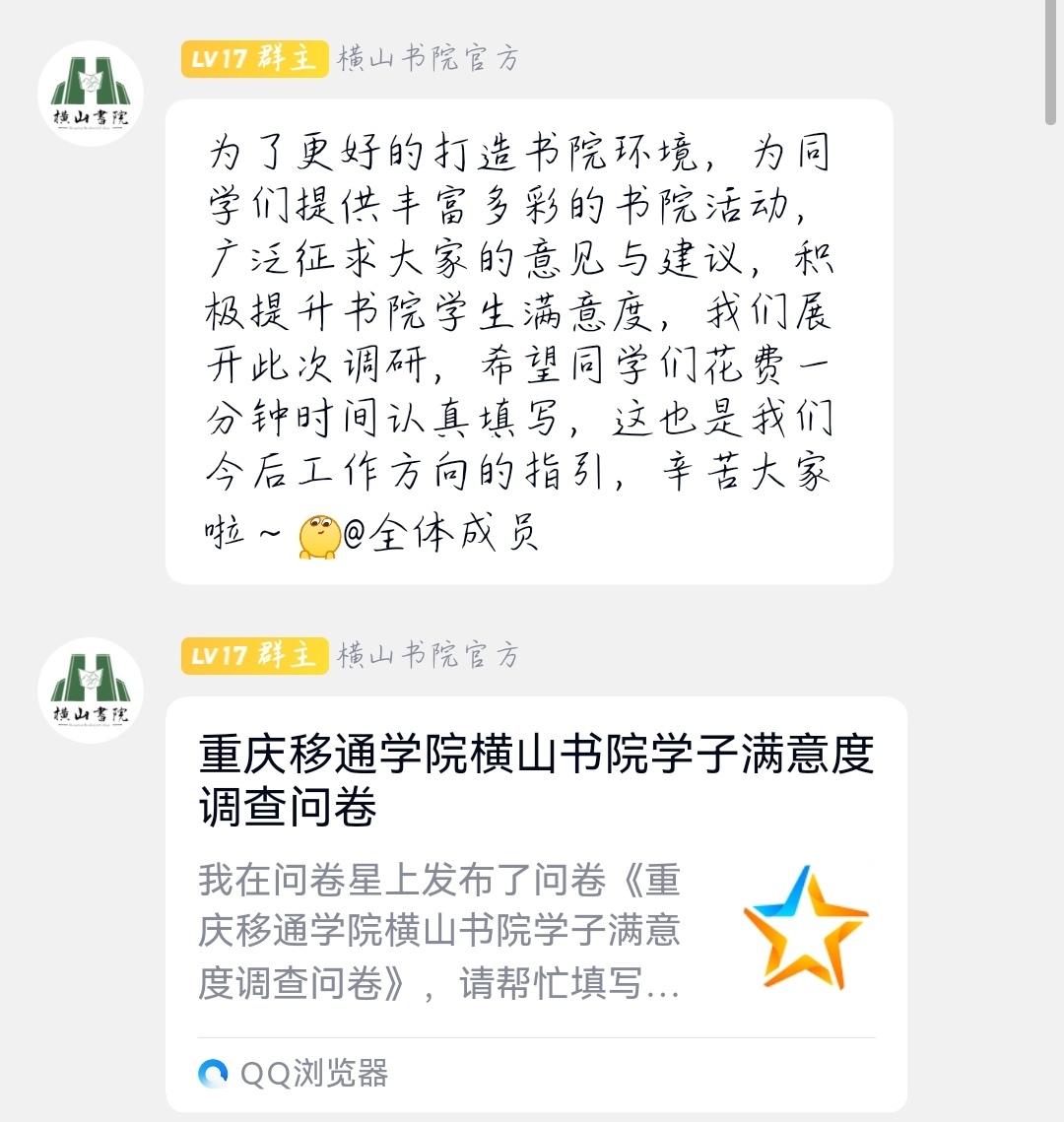 为了更好的打造书院的环境,提升同学们书院生活幸福感,书院的老师们从同学们日常书院生活环境的体验感出发,以调查问卷的方式了解同学们的需求与想法,本次调研共收到600余份有效问卷,整体来看,同学们对书院环境打造、空间使用便捷性等方面相对满意,对书院文化与氛围营造、书院活动开发等方面也提出了相应的意见与建议。