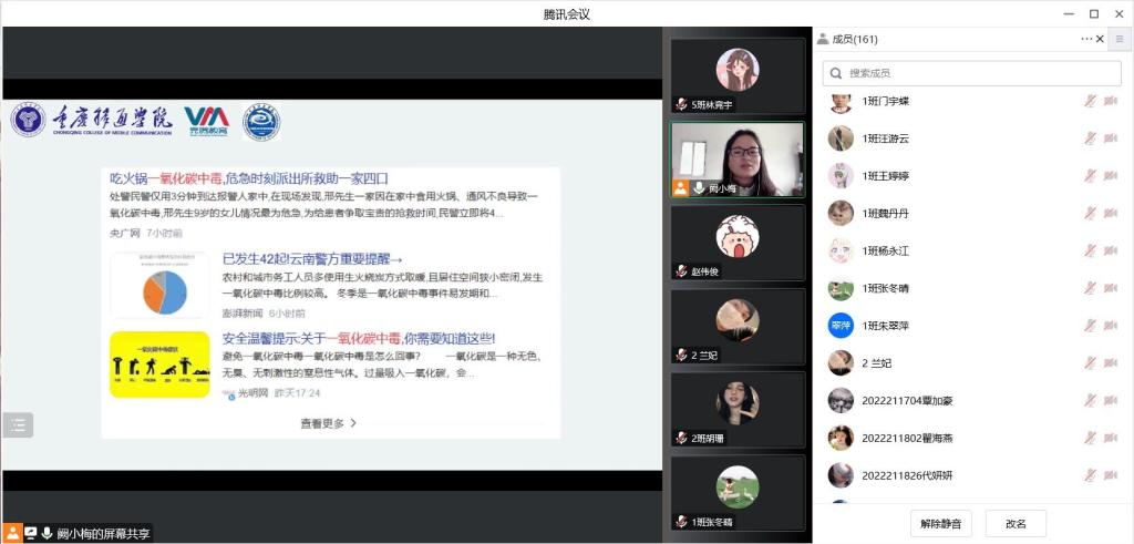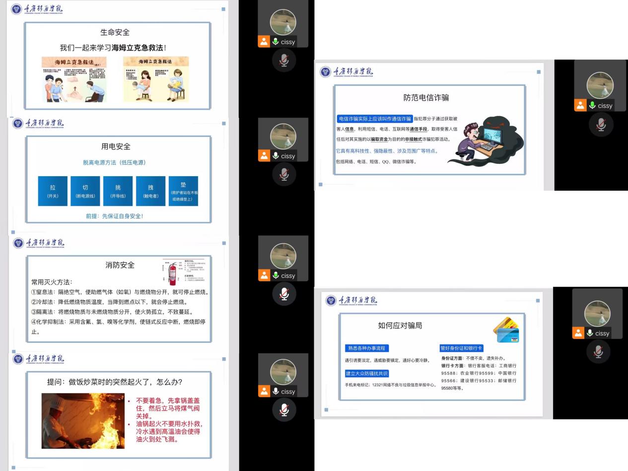 紧绷安全弦,紧扣安全阀。结合近期假期安全形势和发生的各类安全事故,学院再次安排部署了岁末年初的学生安全教育主题年级会。辅导员们制作了专门的年级会内容,分别从疫情防控安全、假期消防安全、交通出行安全、旅游游玩安全、冬季饮食安全、人身财产安全和预防电信诈骗安全等专题内容进行了教育,运用最近发生在全国各地的安全事故作为警示教育案例,告知同学们各类安全防范的重要性和必要性,细致深入地宣传普及事故发生后的紧急救援知识或自救自护的能力。