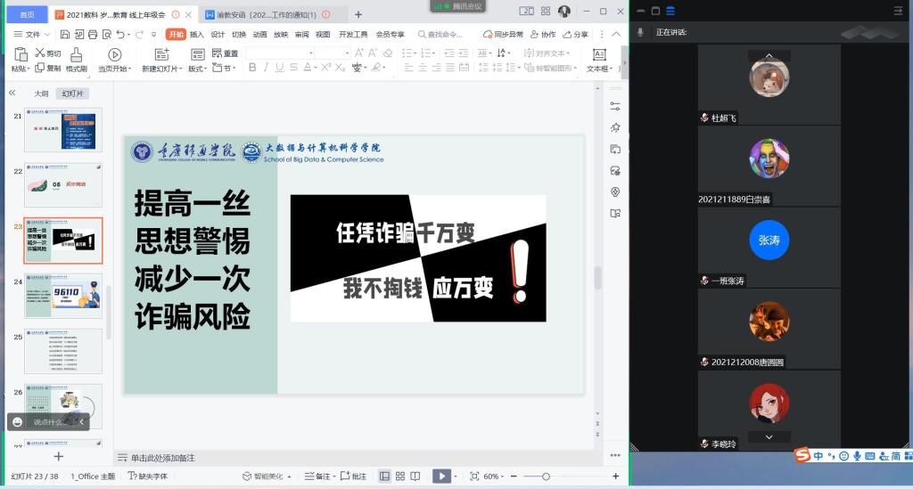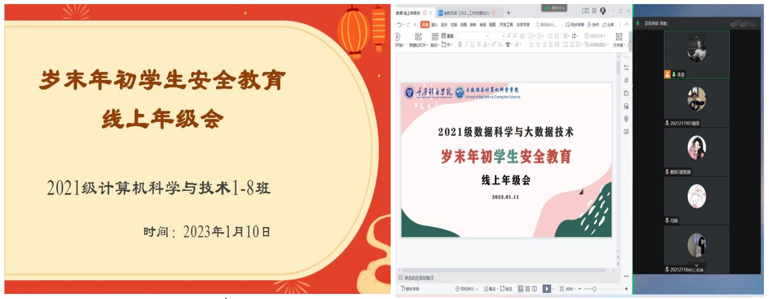 岁末年初,为进一步增强全体学生寒假假期和新春佳节的安全意识,预防人生财产安全事故发生,减少假期中各方面的风险不确定性因素,2023年1月11日至15日,大数据与计算机科学学院辅导员老师们组织开展了假期学生安全教育线上年级会,全力保障学生度过平安、快乐、祥和的假期。