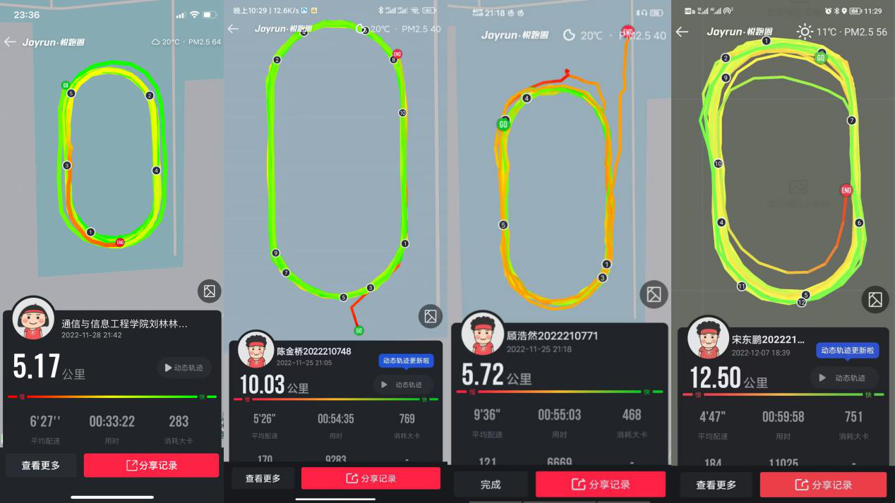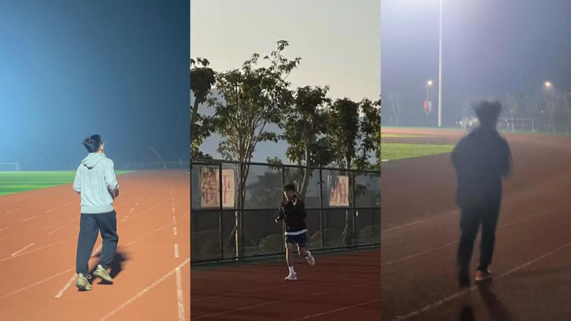 随着同学们陆续返家,跑步主战场从学校操场转移到小区楼下、公园、河堤、健身房等地。同学们始终牢记“我运动,我健康,抗疫情”的口号,即使寒风凛冽,也要在跑道上留下自己的身影。22级的黄世忠同学说,“只要我跑的够快,病毒就追不上我”,以此勉励自己坚持运动。