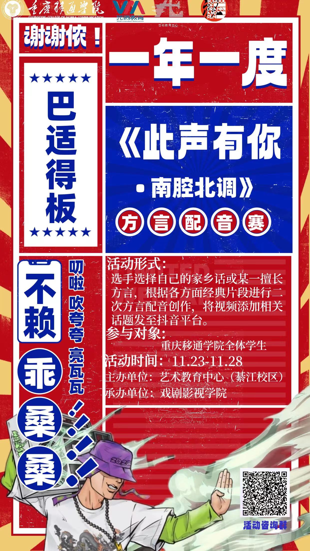 “此声有你南腔北调方言配音大赛”活动是在疫情形势严峻的前提下开展线上活动,灵活运用现有媒介收集参赛视频,审核视频,评比视频。各类配音视频的制作与播放,展现着移通学子的青春活力与艺术底蕴,同时也增强了他们对方言的热爱、对配音的热枕,同学们将作品上传抖音,在抖音平台大放光彩,利用抖音平台进行展示评选,让从未谋面的移通er,通过家乡方言,以充满艺术性的表演形式在网上相会,各色方言合在“移”“綦”碰撞出不一样的火花,向更多的人展现移通er风采。