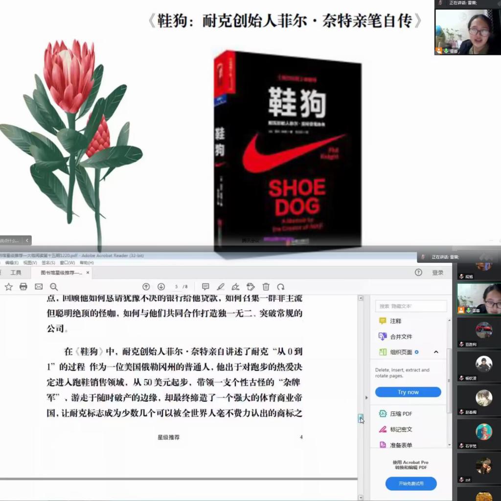 雷蕾老师为同学们分享了《鞋狗:耐克创始人菲尔·奈特亲笔自传》这本书,雷蕾老师谈到:“如果能发现真的喜欢的东西,是多么幸运。当幸运来临的时候,去热血,趁现在。懦夫从不启程,弱者死于路中,只剩我们前行。”
