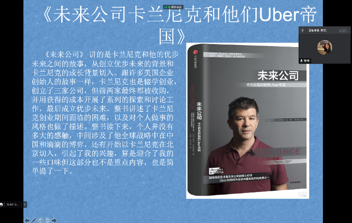 即使是在线上交流,但仍阻挡不了同学们对于阅读的热爱,在会议中,同学们通过自己所制作的PPT侃侃而谈,充分地展示了自身对于大咖阅读书籍的心得以及看法,并且在会议中同学们也热烈的进行了讨论,实现了知识的交流互鉴,余金凤老师也对于会议的热烈氛围给予鼓励与赞赏。