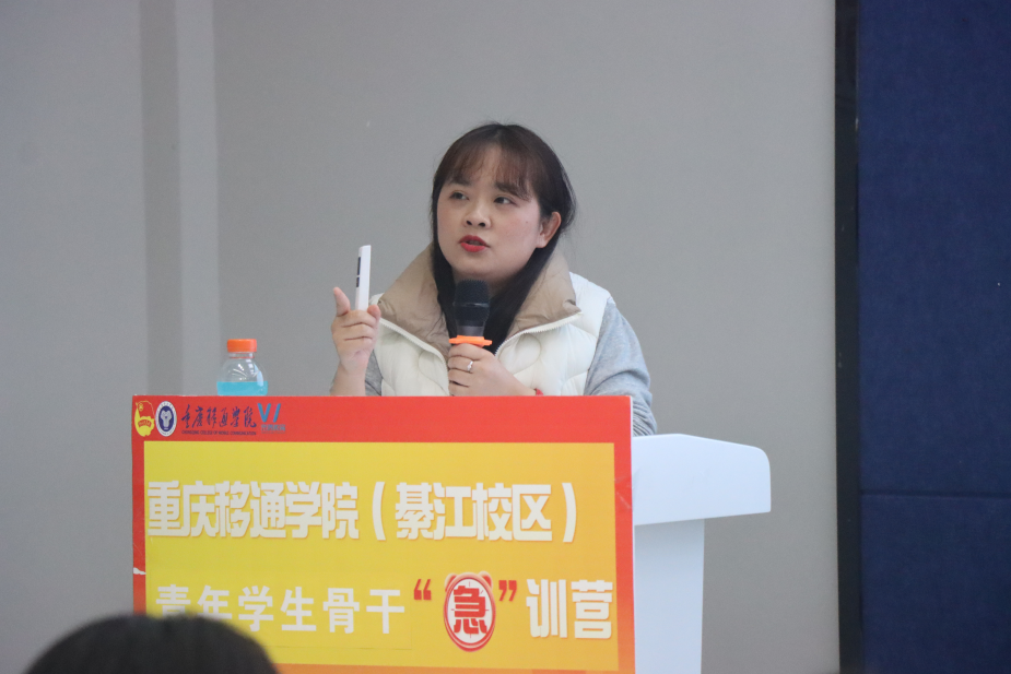 “人无德不立,品德是为人之本”。青年学生骨干要不断锤炼品德修为,涵养高尚情操,树立远大理想,书写人生华章。綦江校区党委委员、学生处副处长梁少锋老师在第一场培训中围绕《新时代高校学生干部的使命与担当》对学生干部进行了思想引领课程的培训。梁老师就党的二十大报告着重点出青年学生干部应坚定不移的听党话、跟党走、怀抱梦想又脚踏实地,敢想敢为又善做善成。同时作为学生干部应做到“四有”:一是有信念、二是有规矩、三是有品行、四是有作为。通过此次课程培训我们也了解到了綦江校区第一届学生干部们加入学生组织、留任部门当学生干部的理由:一是源于热爱,我们热爱部门这份工作、热爱学生组织这个大家庭。二是我们想提升自己,想努力锻炼自己、突破自己,成就更好的自己。三是不想留遗憾,想把自己的所学所获传递给下一届干事,让下一届干事接过我们手中的接力棒,继续在完满路上奔跑。