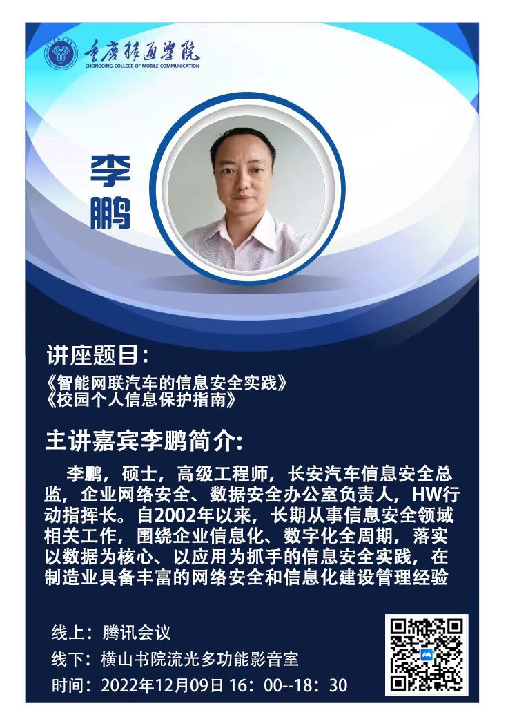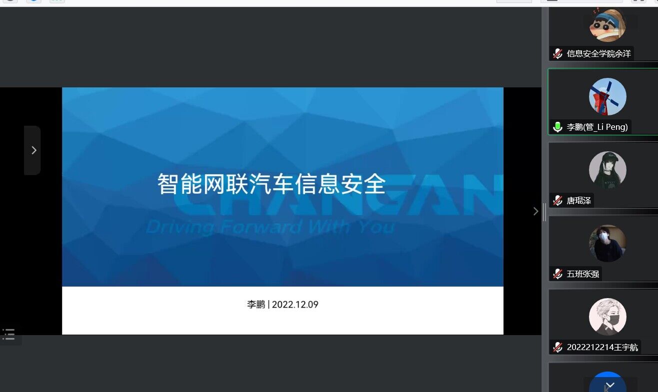 当前,随着互联网与新技术的发展,车联网时代为汽车赋予了更多的功能,也带来了新的隐患,网络安全日渐成为需要关注的重要课题。因此,为使学生通过了解信息安全在行业中的实践,拓宽知识视野,同时增强对信息数据的保护意识。12月9日下午,信息安全学院特邀长安汽车信息安全总监李鹏开展《智能网联汽车的信息安全实践》、《校园个人信息保护指南》专题讲座。本次讲座由信息安全学院王宁副院长主持,全体教师和各专业学生代表通过线上和线下同步参加。
