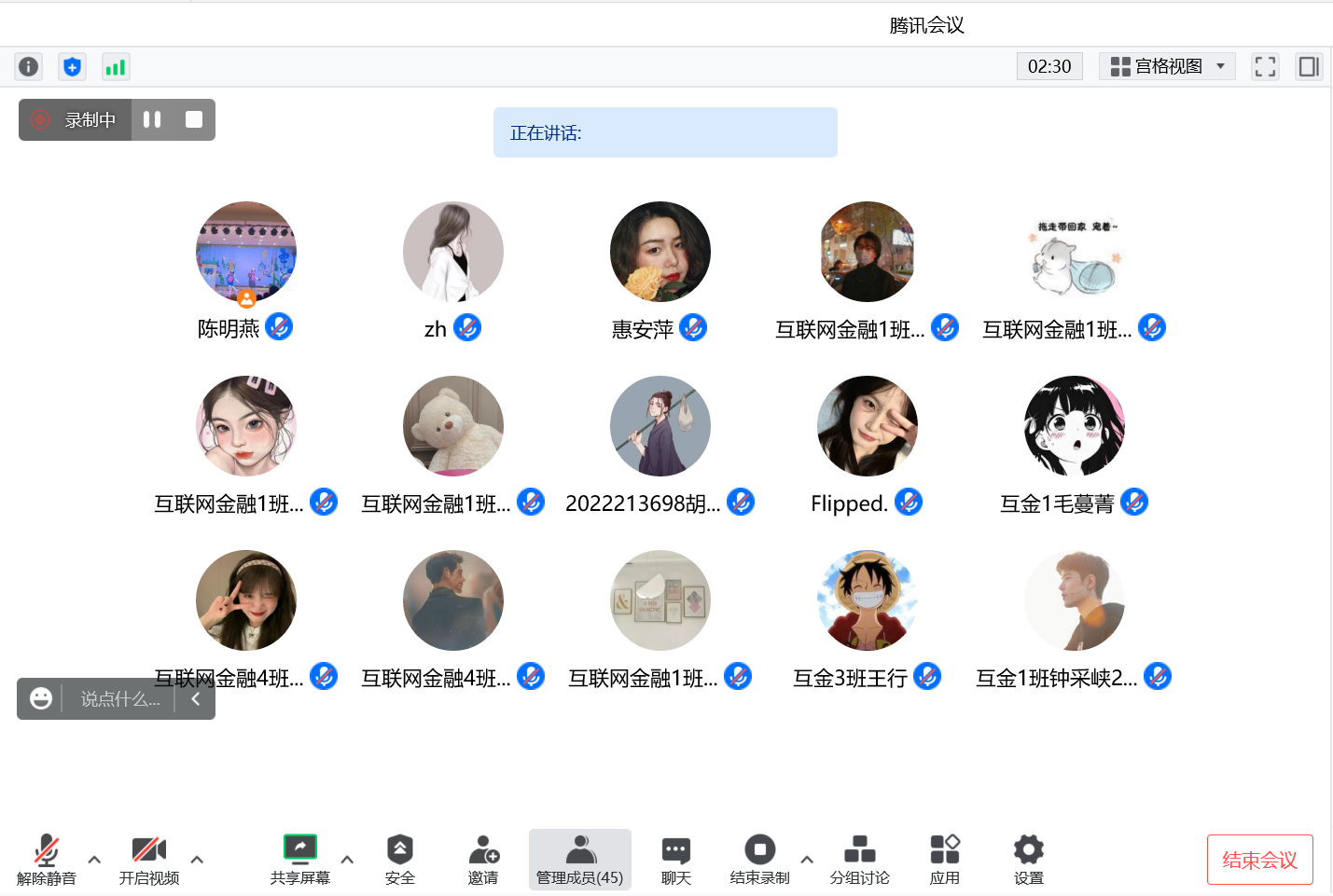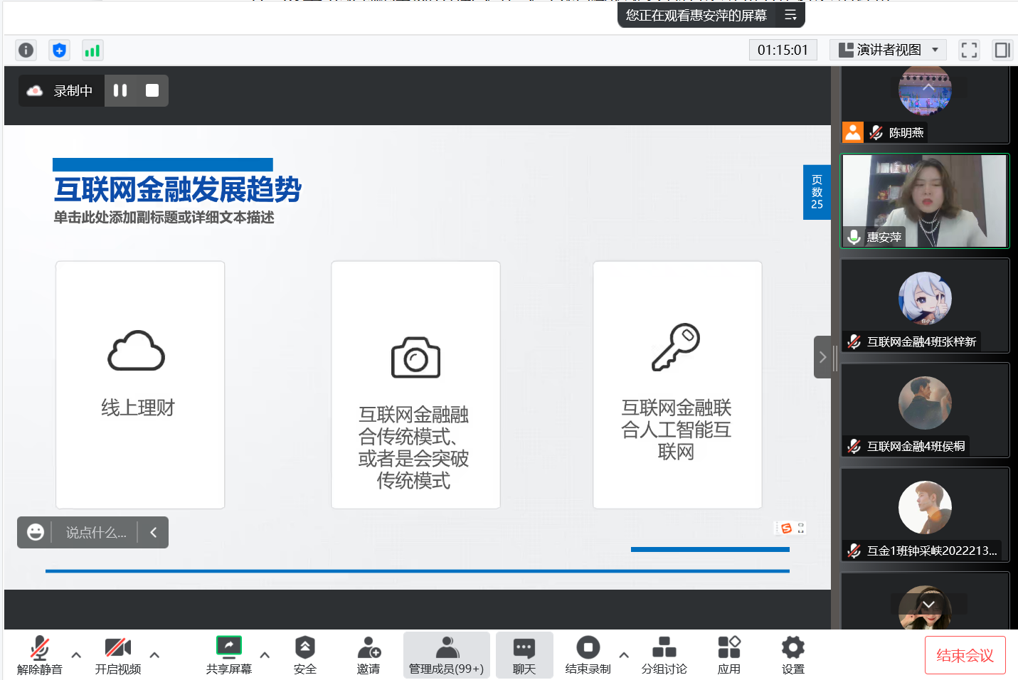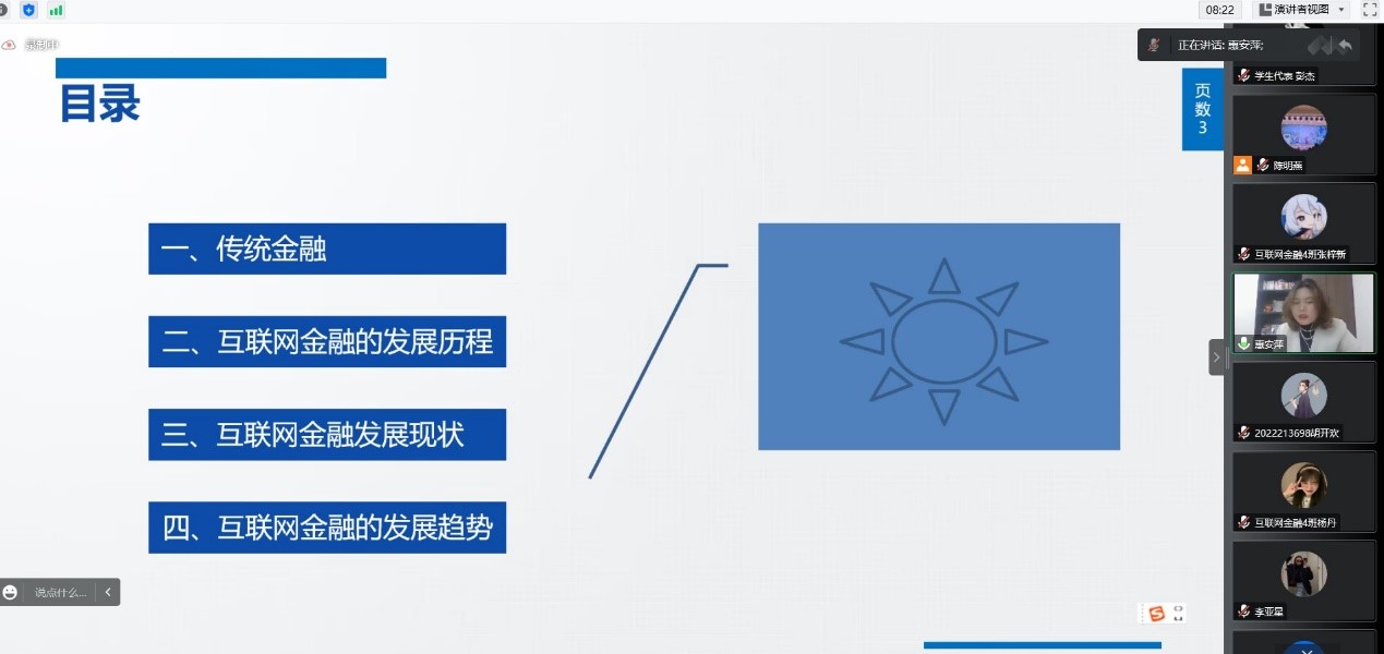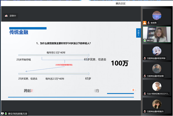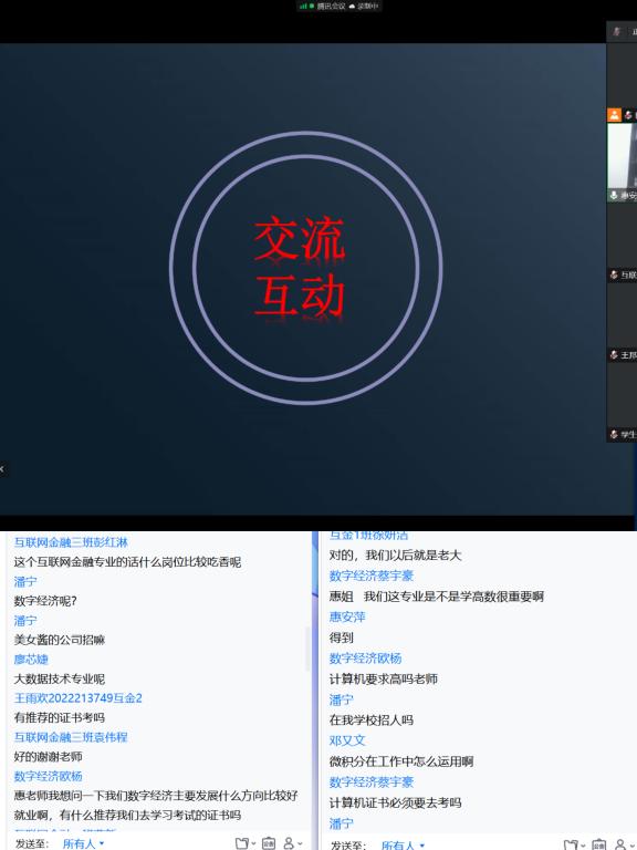 “互联网金融实质是传统金融业务的互联网化,和基于互联网平台开展金融服务。”惠老师一语道破了互联网金融的本质。她深中肯綮的话语深入人心,同学们有感而发,纷纷提出问题。惠老师一一悉心解答,对同学们未来的大学规划,职业选择,考研考公提出了具体的建议和要求。值得一提的是,惠老师的回答不仅仅只局限于“互联网金融”的,她对于“数字经济“”供应链管理“专业的同学们也做了相关的规划指导。她强调,考研和就业并不时一蹴而就的,同学们应该在大一时就确定自己的发展方向,制定好未来四年的计划,并阅读相关书籍和考取有关证书,以适应国家与社会发展的需要。