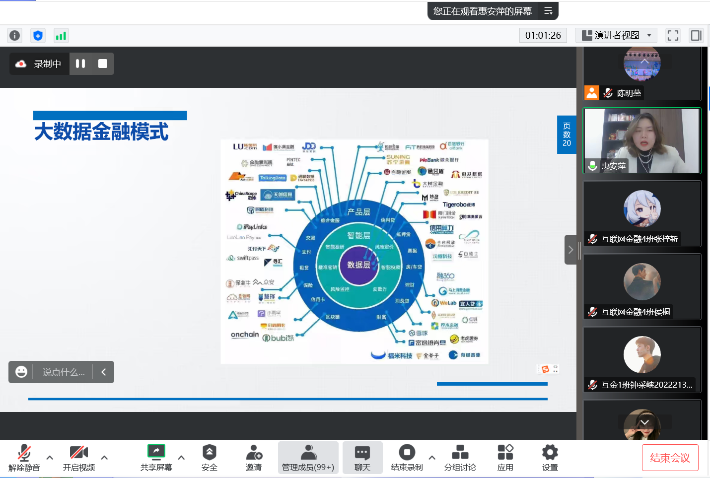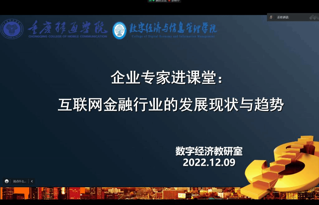 为全面提高数信学院的人才培养质量,使学生了解互联网金融行业的发展趋势、企业的用人需求,促进学生专业技术水平与行业发展接轨,培养学生成为具有商科思维的复合型人才,12月9日下午2点,数字经济与信息管理学院开展了“互联网金融行业的发展现状与趋势”主题讲座。本次活动采用腾讯会议的方式进行,邀请到了中国人民人寿保险股份有限公司重庆市分公司惠安萍老师主讲,由数字经济教研室主任主持,数字经济教研室全体老师、学生代表参加。