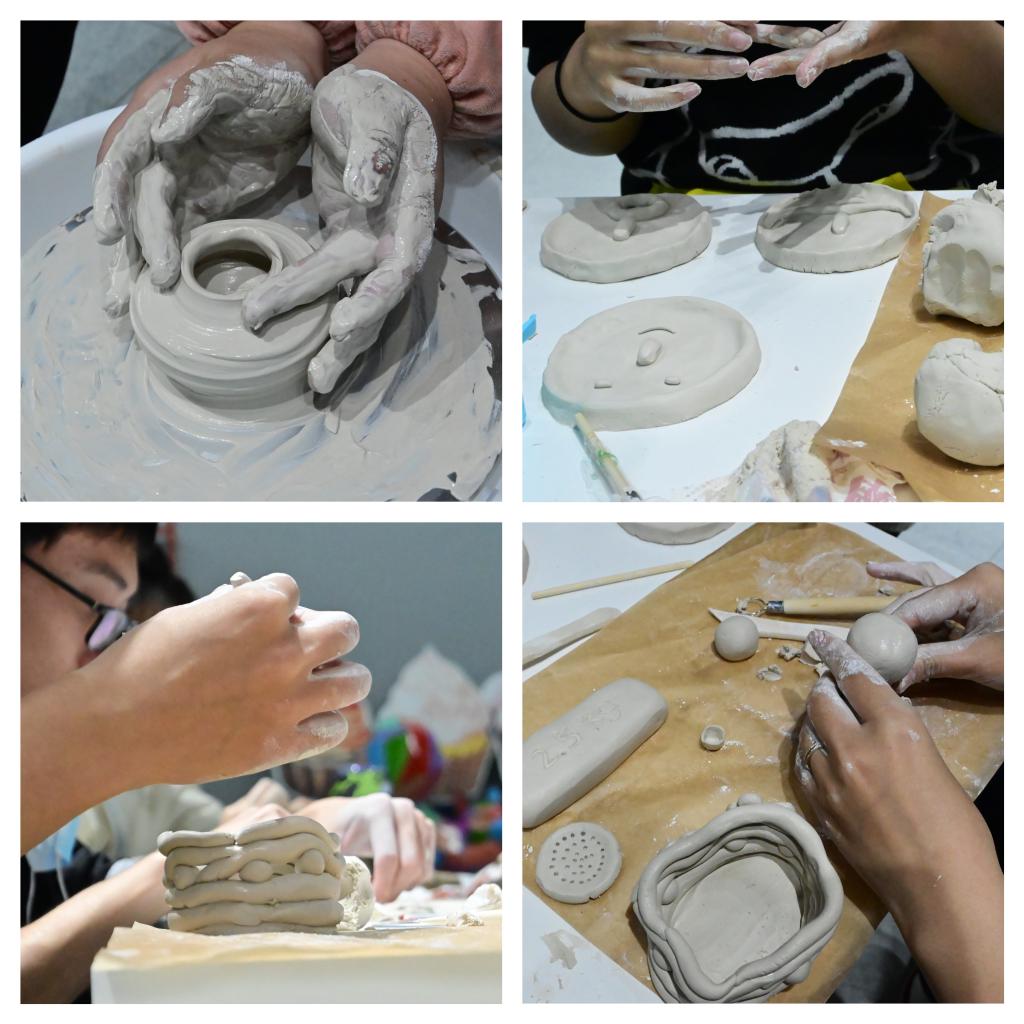 一坨小小的陶泥变身成一件作品,承载了中华大地数以千年的智慧,透露着独属于中华民族的浪漫传承。同学们脚踩拉胚机,泥土在陶盘上变得鲜活,转眼之间,便有了“七十二般变化”。现场氛围轻松欢快,有的同学一气呵成,泥杯、泥盘手到擒来。但也有“我想捏个杯子,没想到最后做成了盘子”的奇妙缘分。小试牛刀之后,同学们便开始了新一轮的泥塑进阶——泥条盘筑。在经历了漫长的泥条制作后,同学们便三两合作,将泥条从下向上盘筑成型,成型的泥塑极具个性,展现出自己的创意思维。