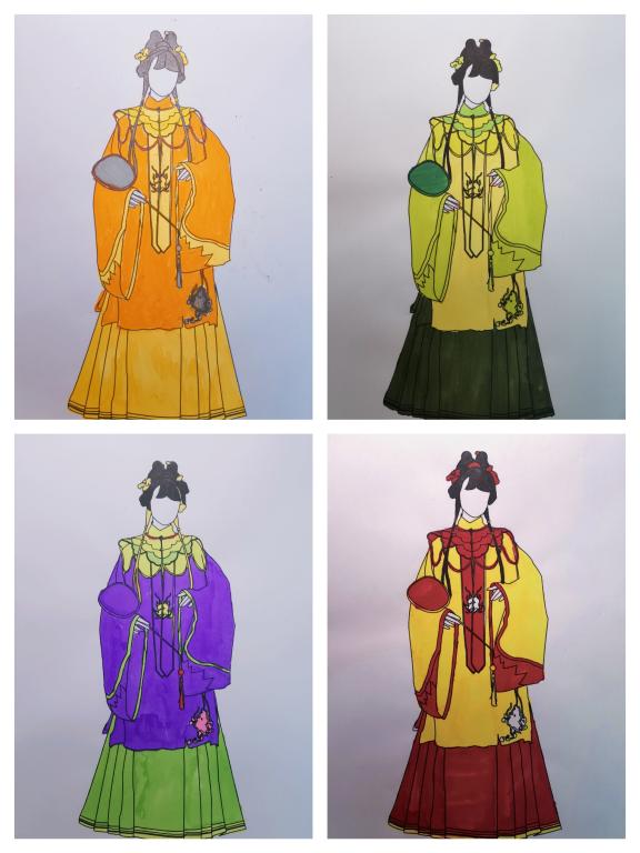 为让同学们发挥自己的想象力、创造力,用自己所学习到的知识结合古今创作出自己心中的礼仪服装,我们准备了彩绘环节,同学们可以根据提供的模板自行涂色或者自己创作绘画一个属于自己独一无二的汉服样式。