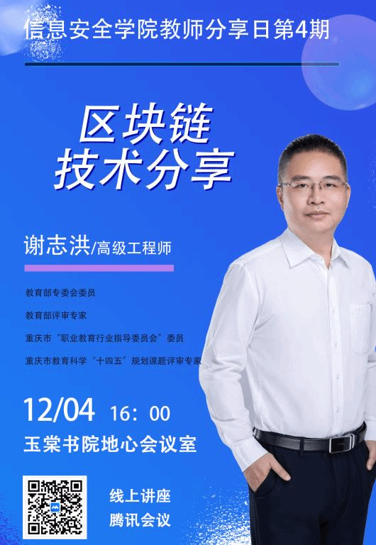 培训分享、交流研讨、经验共享,既是播种的过程,也是沉淀收获的过程。为了让团队成员能够相互取长补短,促进思维融合,弥补自己知识盲区,增加兴趣点,扩大培训受益面,使团队成员人人会分享懂分享乐分享,信息安全学院特推出“教师分享日”系列教研活动。现已推出第0期“互联网+创新创业大赛备赛经验分享活动”、第1期“远景百万奖励基金”示范课分享会、第2期“新工科背景下人才培养方案和课程建设”、第3期“网络安全技术专项培训成果”等分享会。第4期分享会于2022年12月4日下午15:30在玉棠书院地心会议室开展,主题为“区块链技术分享会”,由信息安全学院谢志洪老师进行分享,王宁院长和部分专任老师参加。