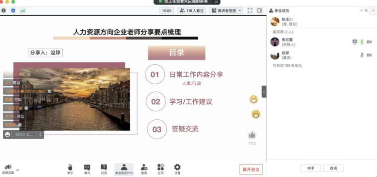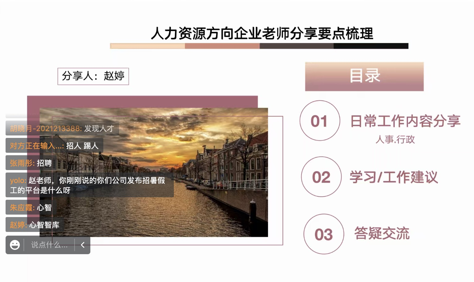 分享嘉宾赵婷部长就人力资源管理的前景、就业趋势、工作内容等方面进行了深入细致地分享。赵婷老师表示,人才是一个企业最宝贵的财富,人力资源管理就是了为了企业人才储备所服务,具体工作内容有人力资源规划、招聘与配置、培训与开发、绩效管理、薪酬福利管理、劳动关系管理。人力资源管理就业前景好,因为如何对人才进行最有效的管理,最有效的配置,发挥人才最大的价值,这已经成为当今企业越来越关注的问题。