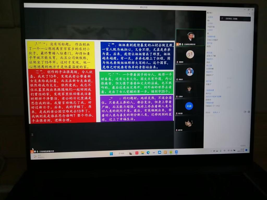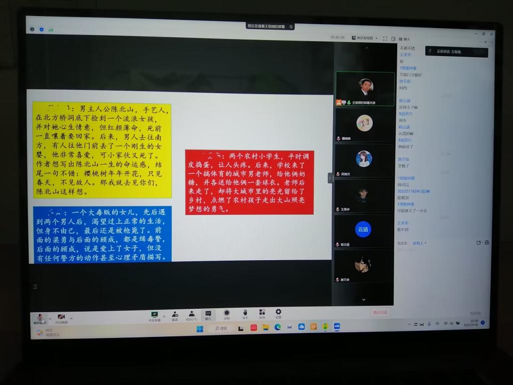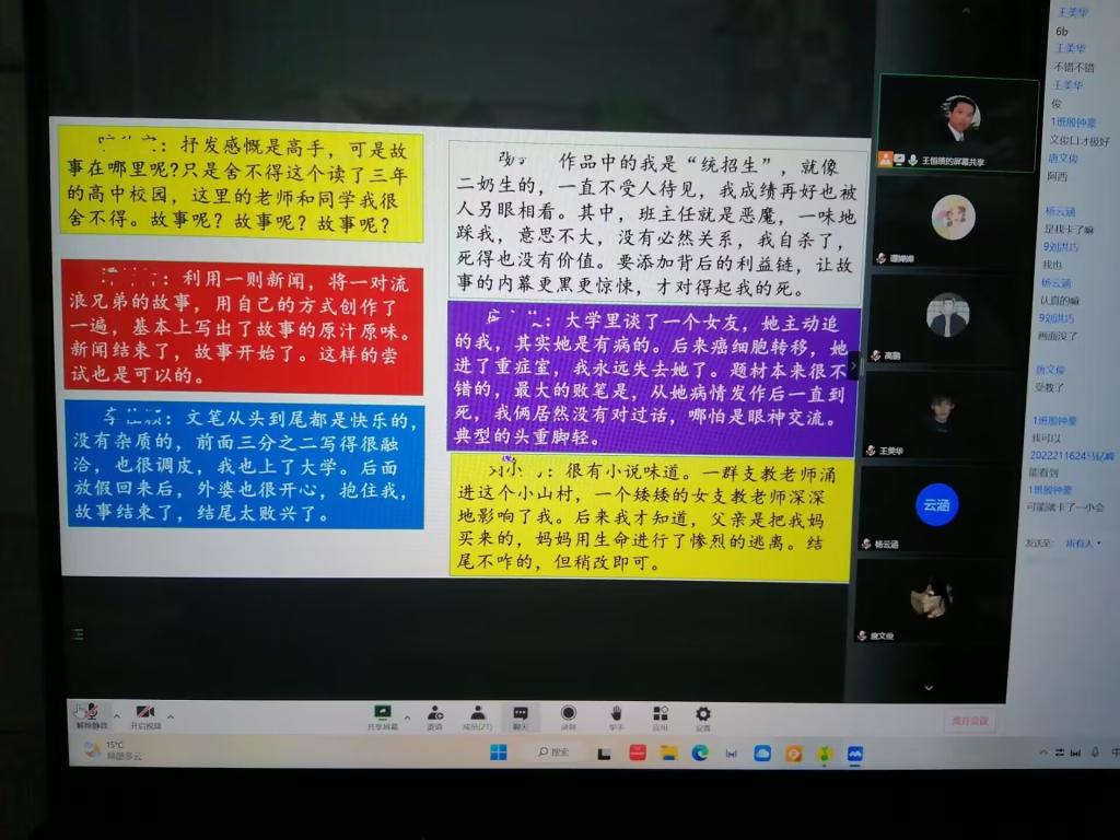 首先王老师将每位同学的作业点评放到公屏上,然后逐一抽丝剥茧。讲到某位同学的作业病根时,王老师总会迅速给出治疗方案,他脑子里不知咋装了那么多张口即来的金点子,配以他声情并茂的讲述,平凡的故事也让他点燃了火把。