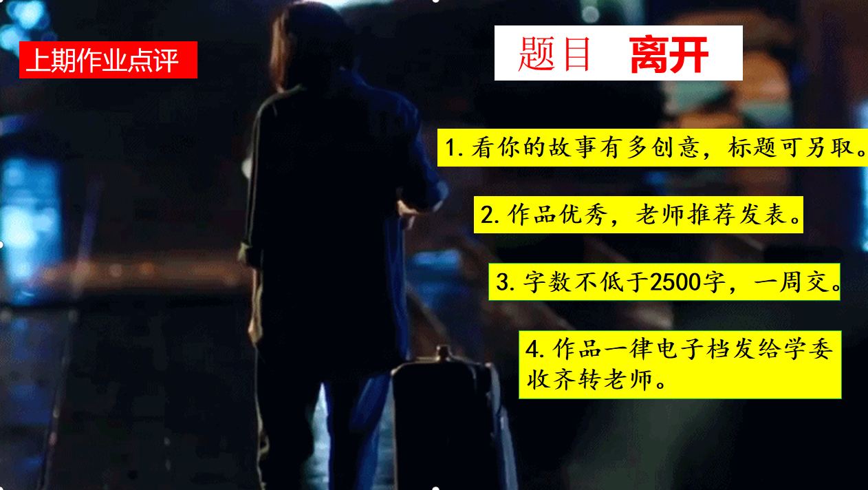 谢蔓同学的作品,王老师不吝赞美之辞。首先,作业规定只写2500字,谢蔓同学却写了将近9000字,王老师赞道“先不管写得怎么样,下笔就能洋洋万言,这是写出好作品的原始基础。创作最怕无话可说。”谈到内容时,“要给谢蔓同学加鸡腿。创作的手法很高级,令人欢喜。我死了13年,发现我老公带着新女友来给我扫墓,而且在新女友面前依然称我为太太,依然爱我。我忍不住从墓里爬出来跟随他们一起回到我们曾经的家,发现家里依旧像我活着时那样干净整洁,老公的日记里满是思念我的话。我留言劝他忘了我,好好过新的日子。后来我的梦醒了,原来,是我的老公因空难死去了13年,我俩到底是谁在思念谁啊?整个作品手法很老到,逻辑合理。”王老师通过这样的点评,表扬了谢蔓同学在创作中的新思想新方向,并以此鼓励同学们创作时,胆子再大一点,步子再阔一点,不断去触摸新的创作高度,从而写出厚重的作品。